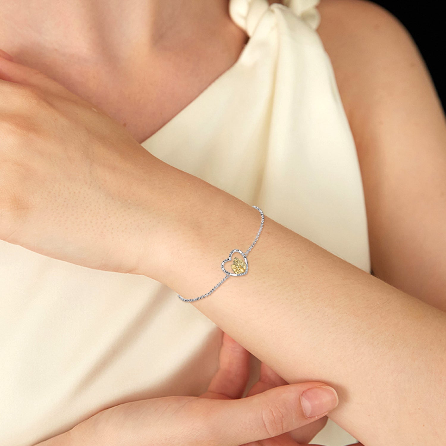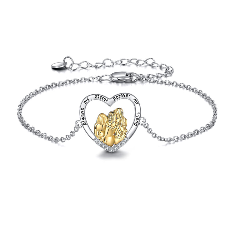 Sterling Silver Two-tone Circular Shaped Cubic Zirconia Sisters & Heart Charm Bracelet with Engraved Word