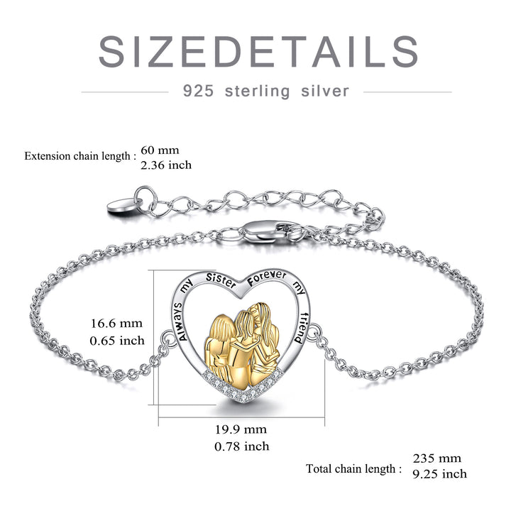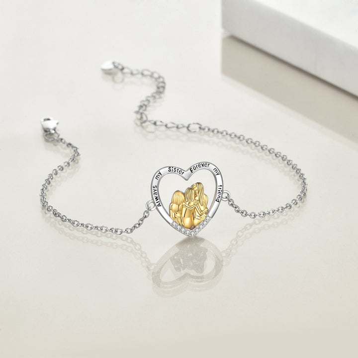 This charm bracelet is crafted from sterling silver with a two-tone option (white and yellow gold finish). It features a circular heart charm with Cubic Zirconia and is engraved with "Always My Sister, Forever My Friend."