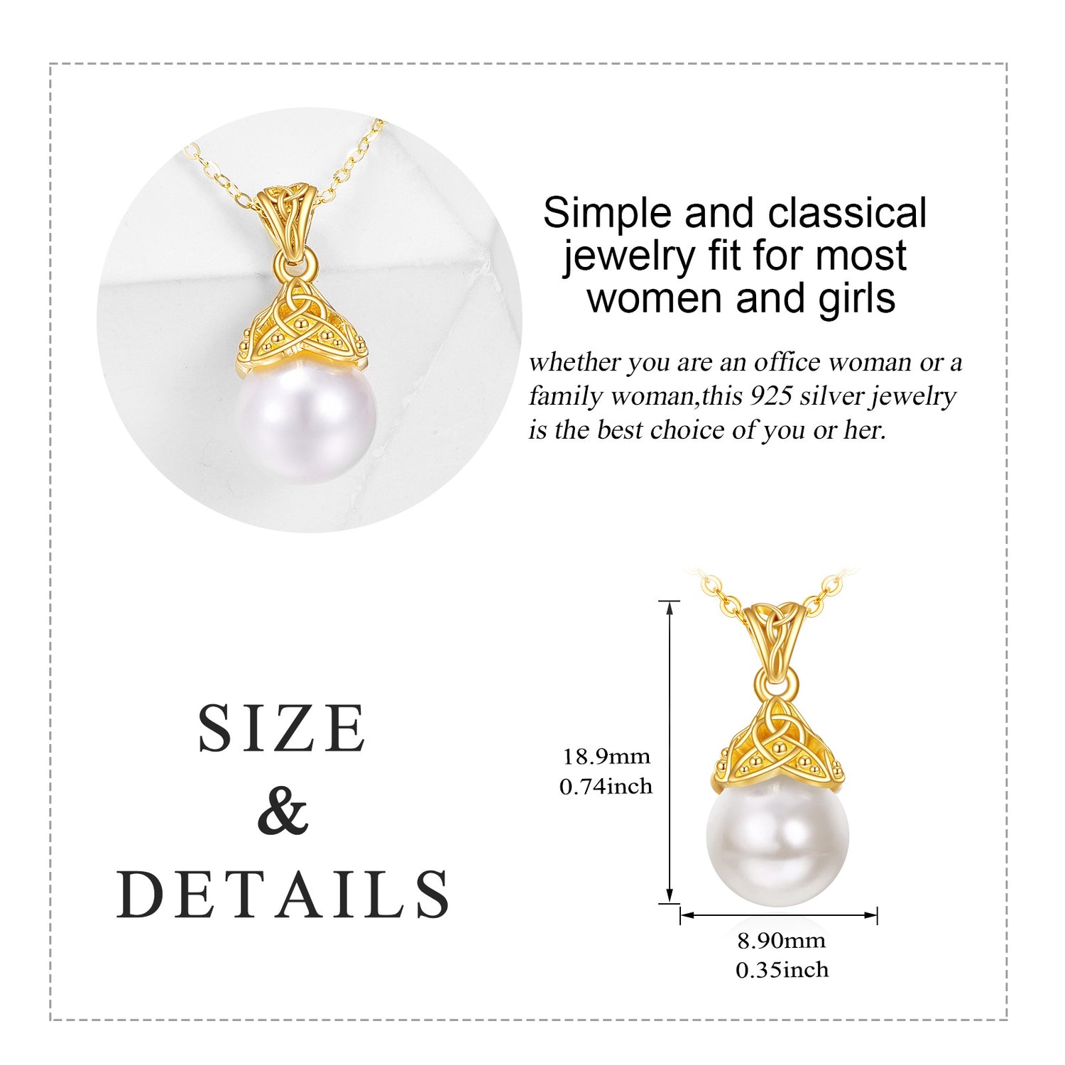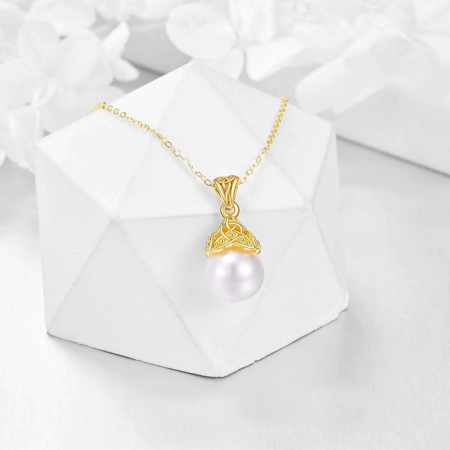 This 14K Gold Circular Shaped Pearl Celtic Knot Pendant Necklace by YFN is an exquisite statement piece for women, blending tradition and sophistication. The circular pendant, crafted from 14K Gold, artistically combines the luminous Pearl center with the intricate Celtic knot, symbolizing eternal love and unity. The premium gold setting ensures durability and a lifetime of shine.