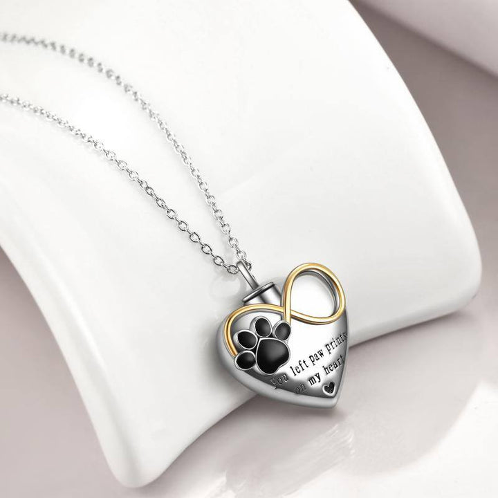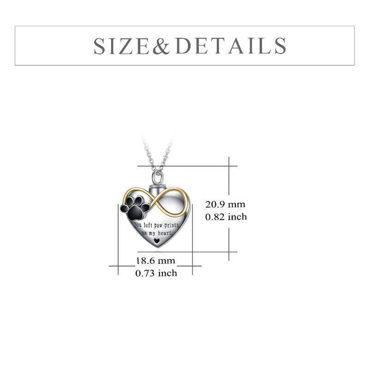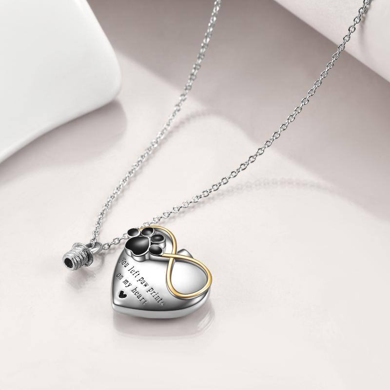 Sterling Silver Two-Tone Paw With Infinity Symbol Heart Urn Necklace For Ashes With Engraved Word For Women
