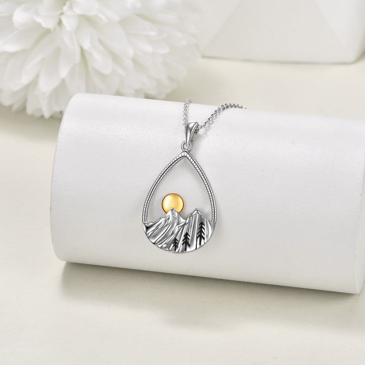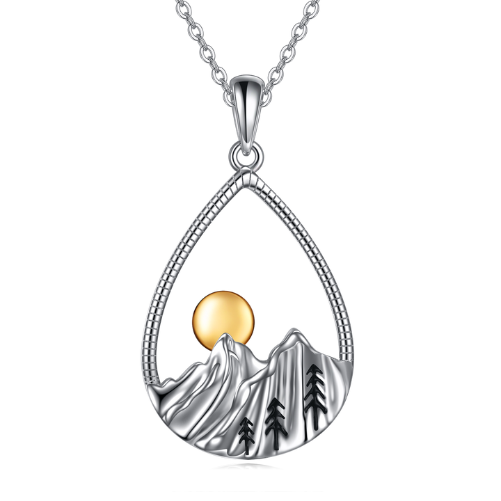 Sterling Silver Two-tone Drop Shape & Mountains & Sun Pendant Necklace