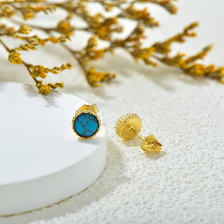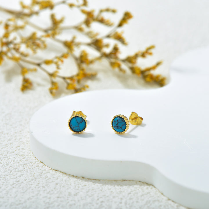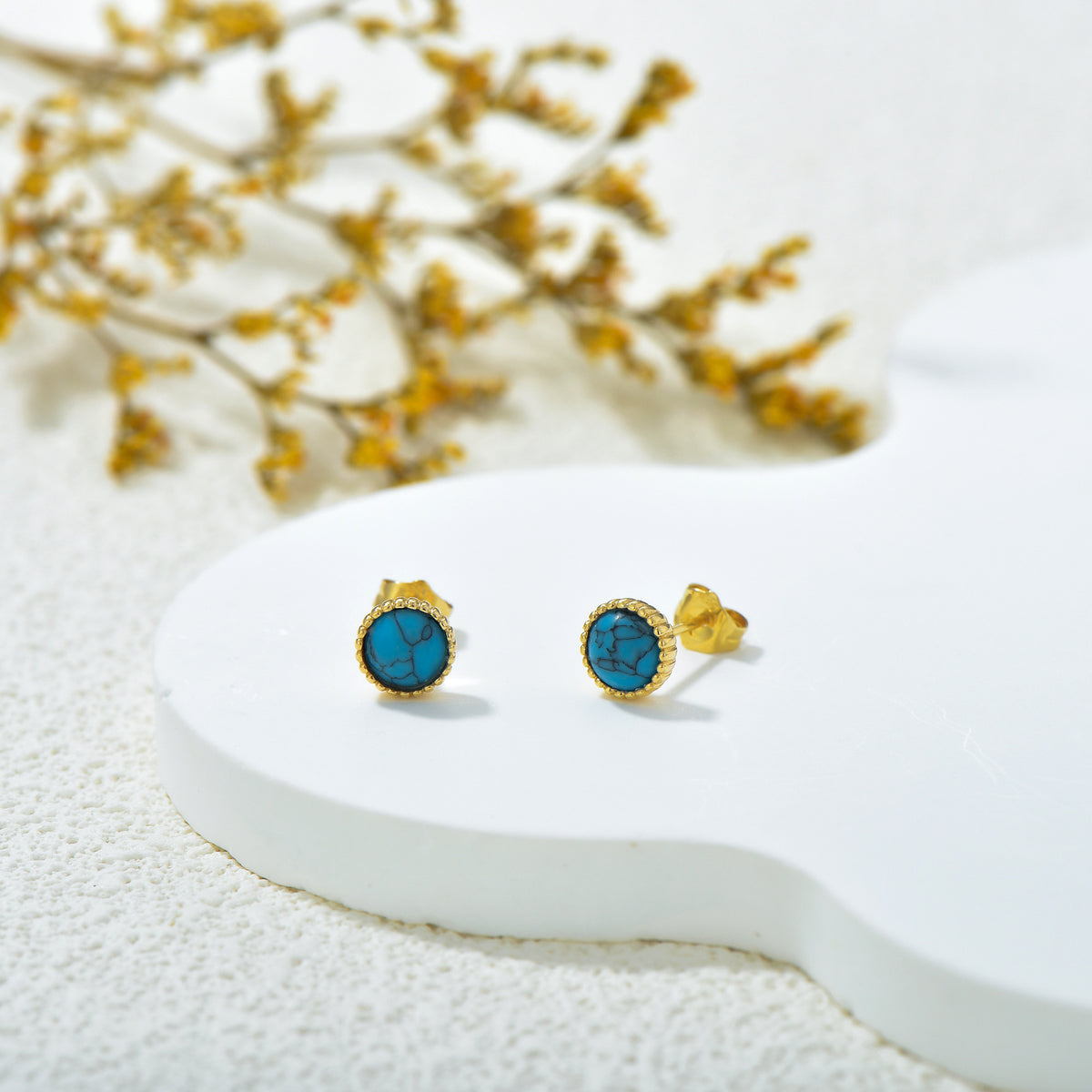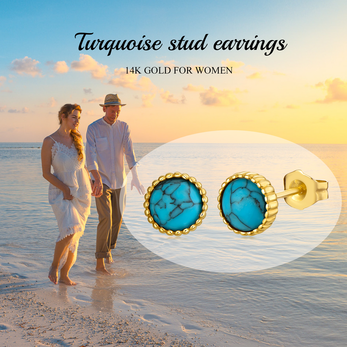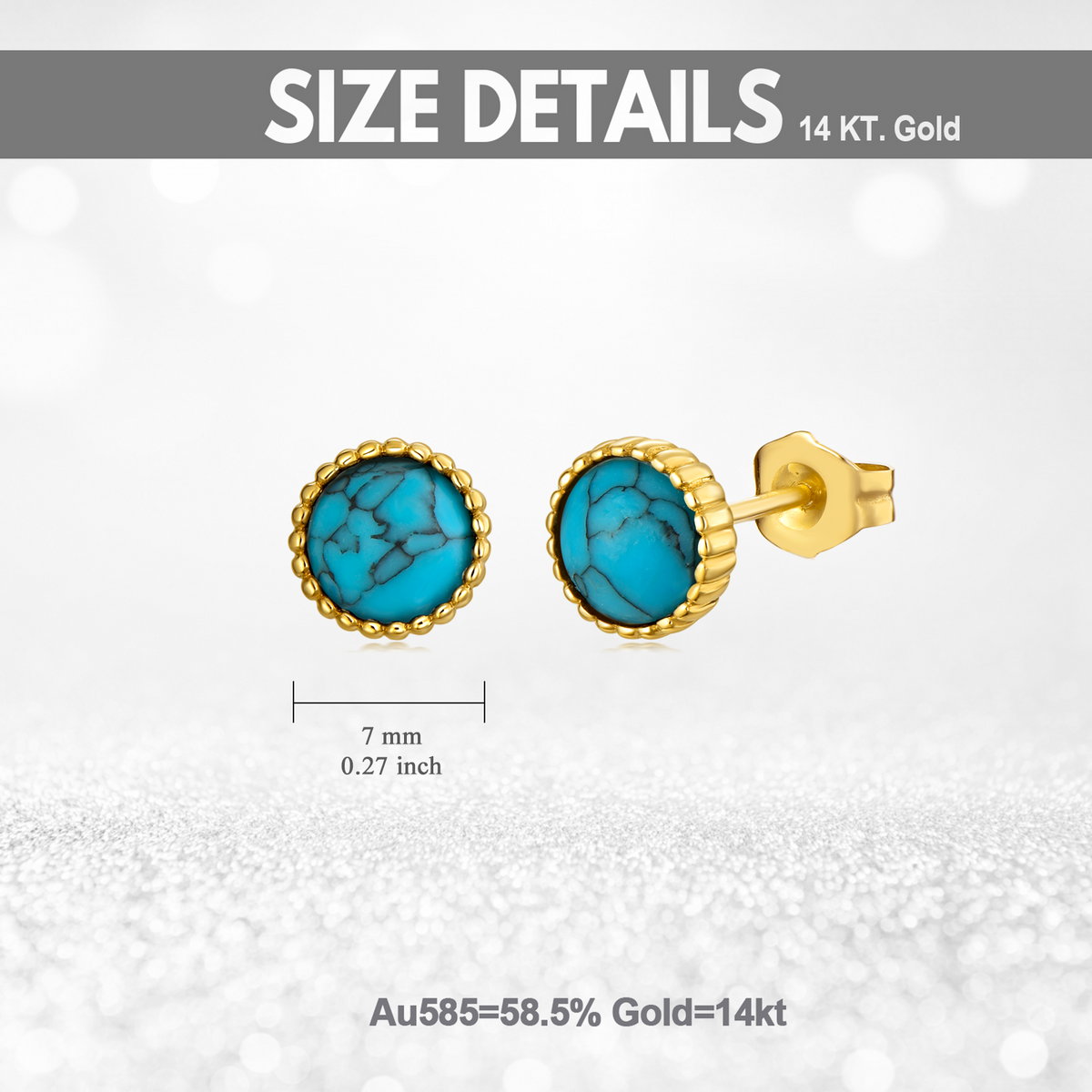 These Circular Stud Earrings are crafted from High-Quality 14K Gold, Adorned with a Stunning Round Turquoise Gemstone.