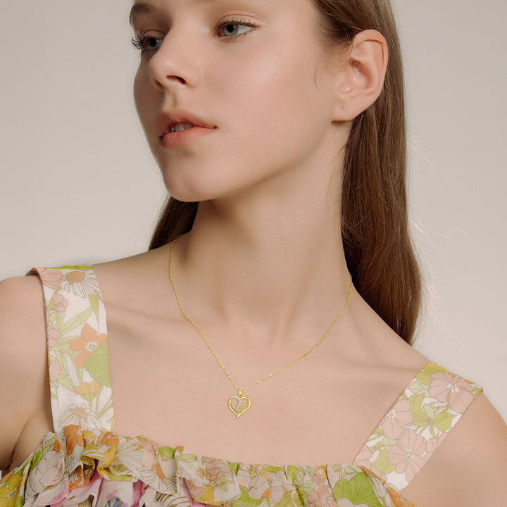 Crafted in 14K gold with clear heart-shaped cubic zirconia. Features circular pendant with engraved detail. Includes coordinating chain with secure clasp.