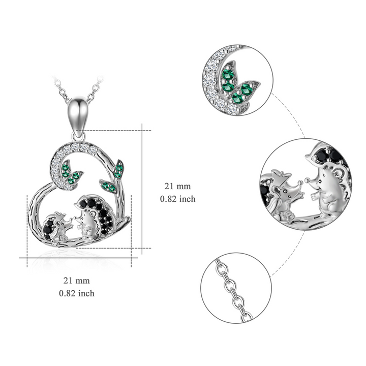 Crafted in sterling silver with white gold plating. Features green cubic zirconia, hedgehog, leaf motifs, and heart-shaped pendant. Includes matching chain.
