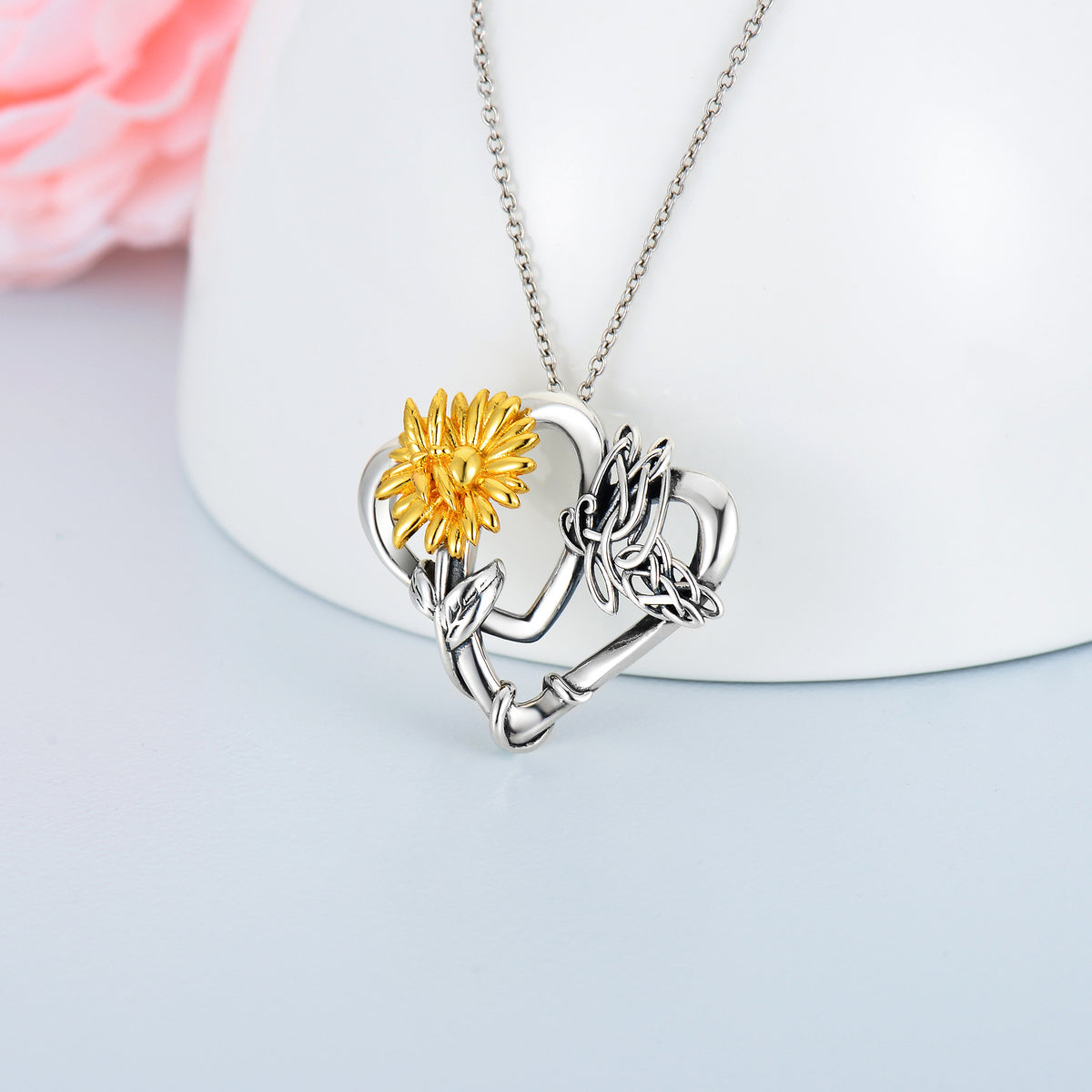 This Sterling Silver Two-Tone Butterfly & Sunflower With Heart Pendant Necklace by YFN features charming Butterfly, Sunflower, and Heart motifs, blending timeless elegance with modern charm. Crafted from high-quality sterling silver and available in both Silver Oxide and Gold finishes, this piece adds a touch of sophistication and grace to any outfit.