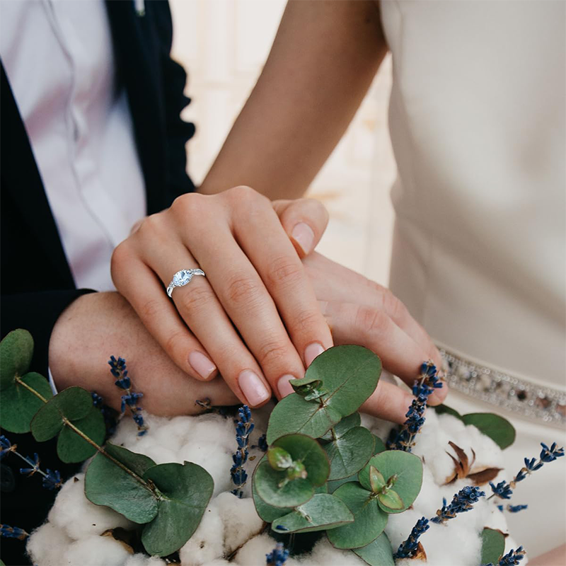 Engagement ring crafted from solid 14K white gold, featuring one oval Aquamarine center stone. Set with multiple round Moissanite side stones. Available in standard US ring sizes 5 to 10.