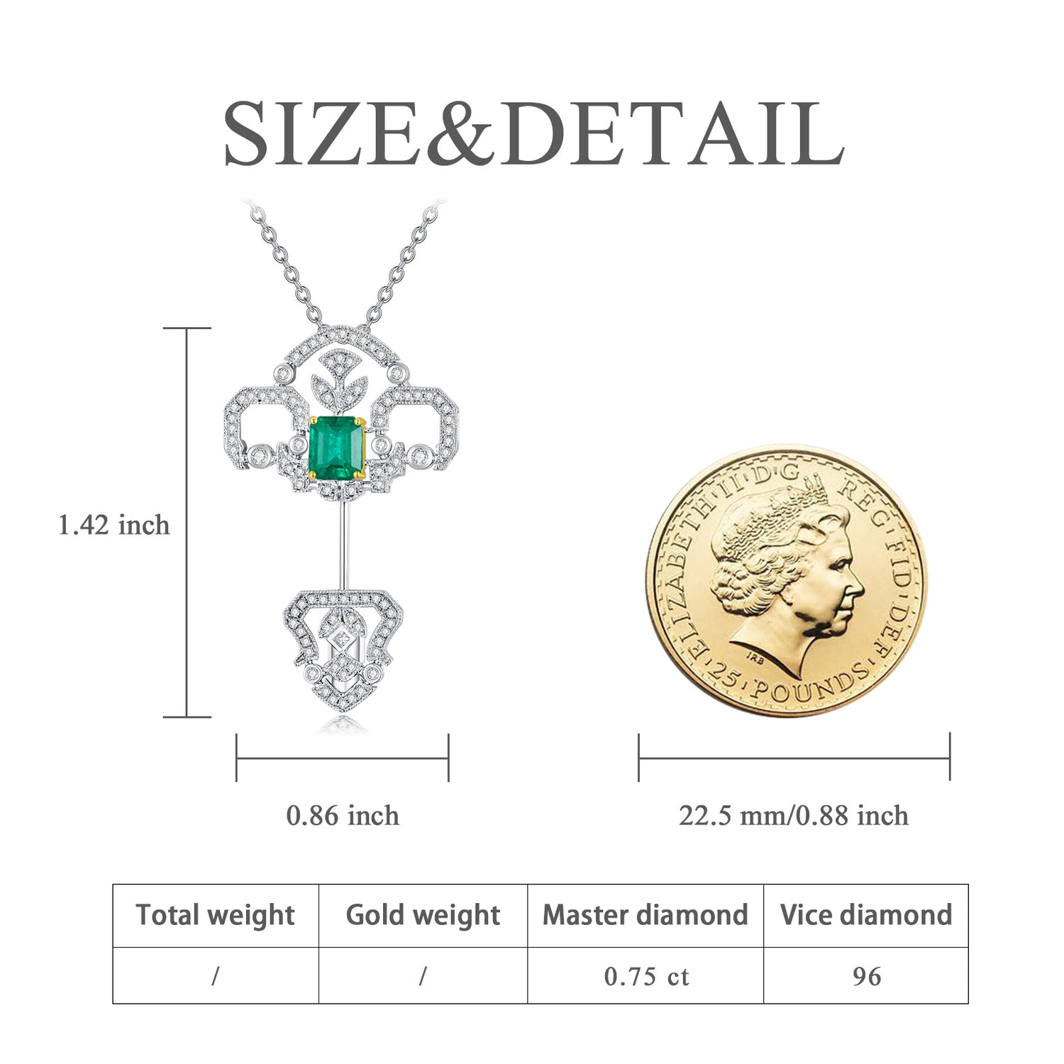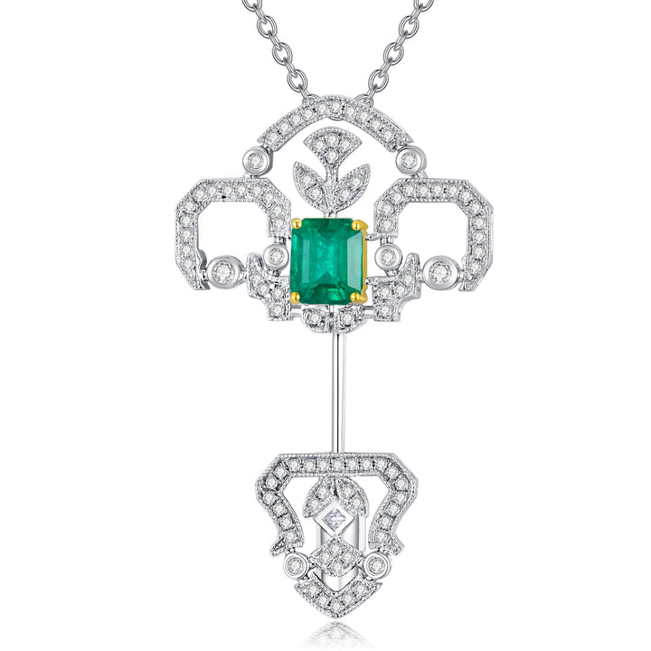 This pendant necklace is crafted from Solid 18K White Gold and features a Key motif pendant set with an Emerald gemstone.
