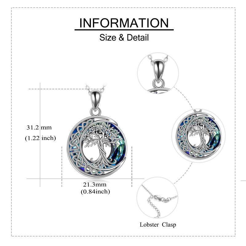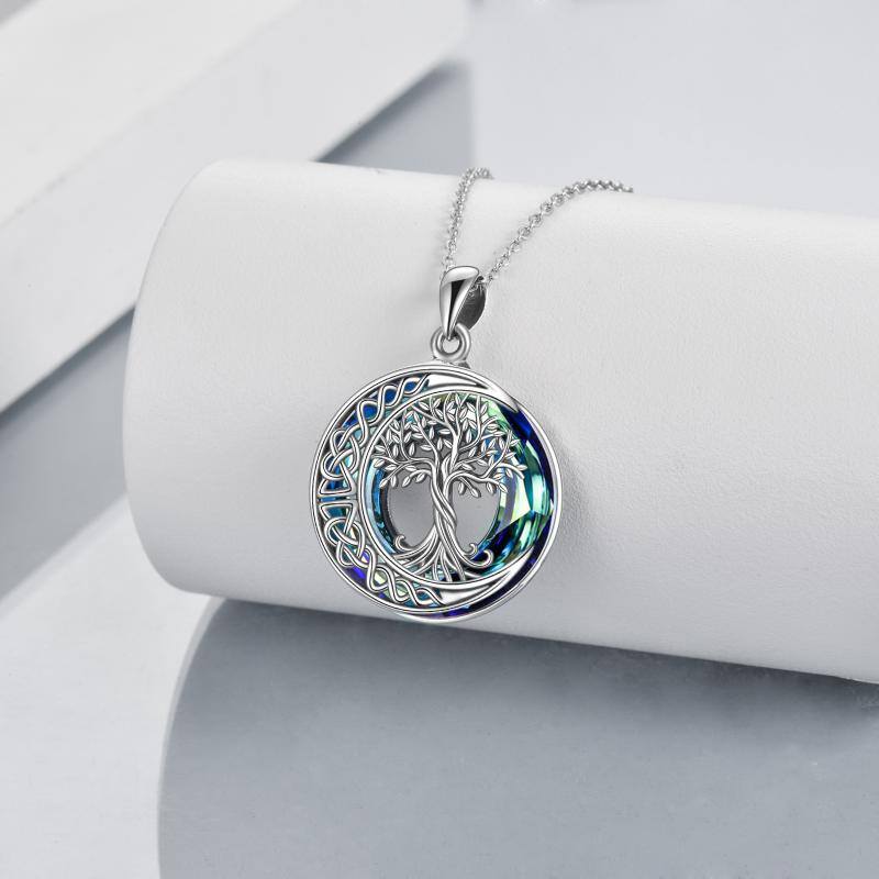 This Tree Of Life Celtic Knot & Moon Circle Crystal Pendant Necklace by YFN is a meaningful and stylish accessory. The circular sterling silver pendant is white gold plated and features a captivating blue crystal. It intricately combines the Tree of Life (growth), the Celtic Knot (eternal love), and the Moon (femininity), making it a versatile piece that symbolizes harmony and unity.
