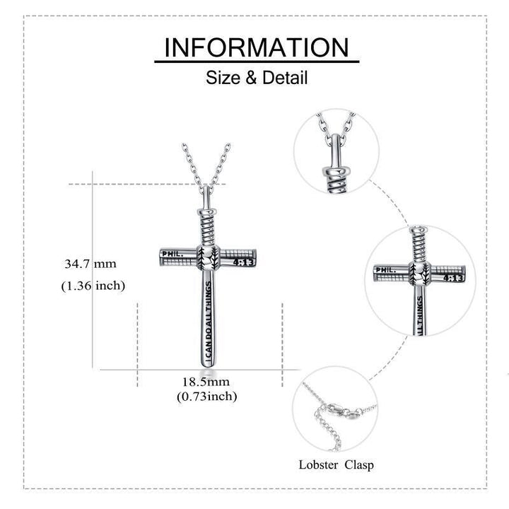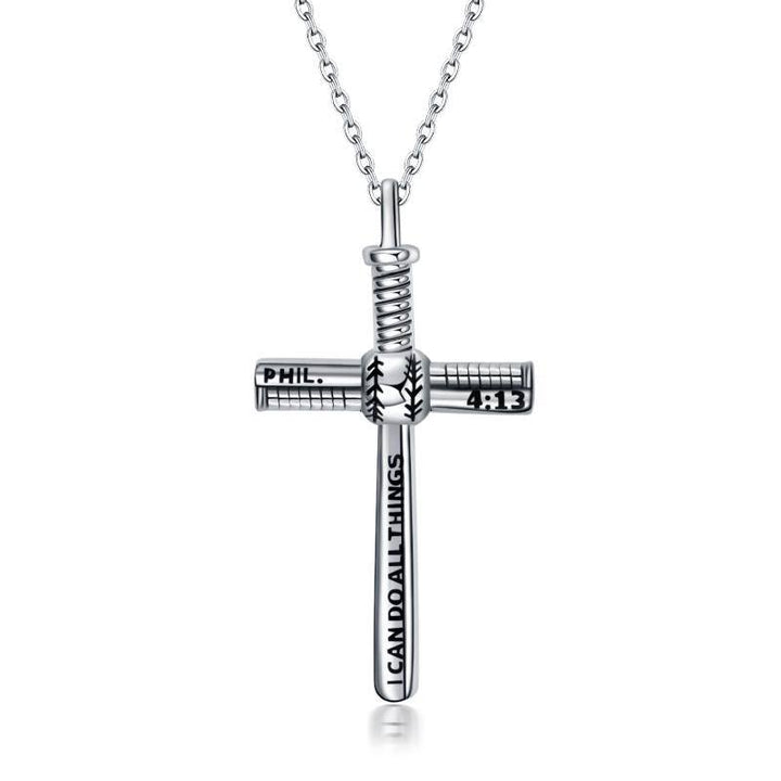 Handcrafted from premium Sterling Silver with a Retro Silver finish, this no-stone, unisex Pendant Necklace features a Baseball Cross Design and the engraved message "I Can Do All Things Through Christ Who Strengthens Me."