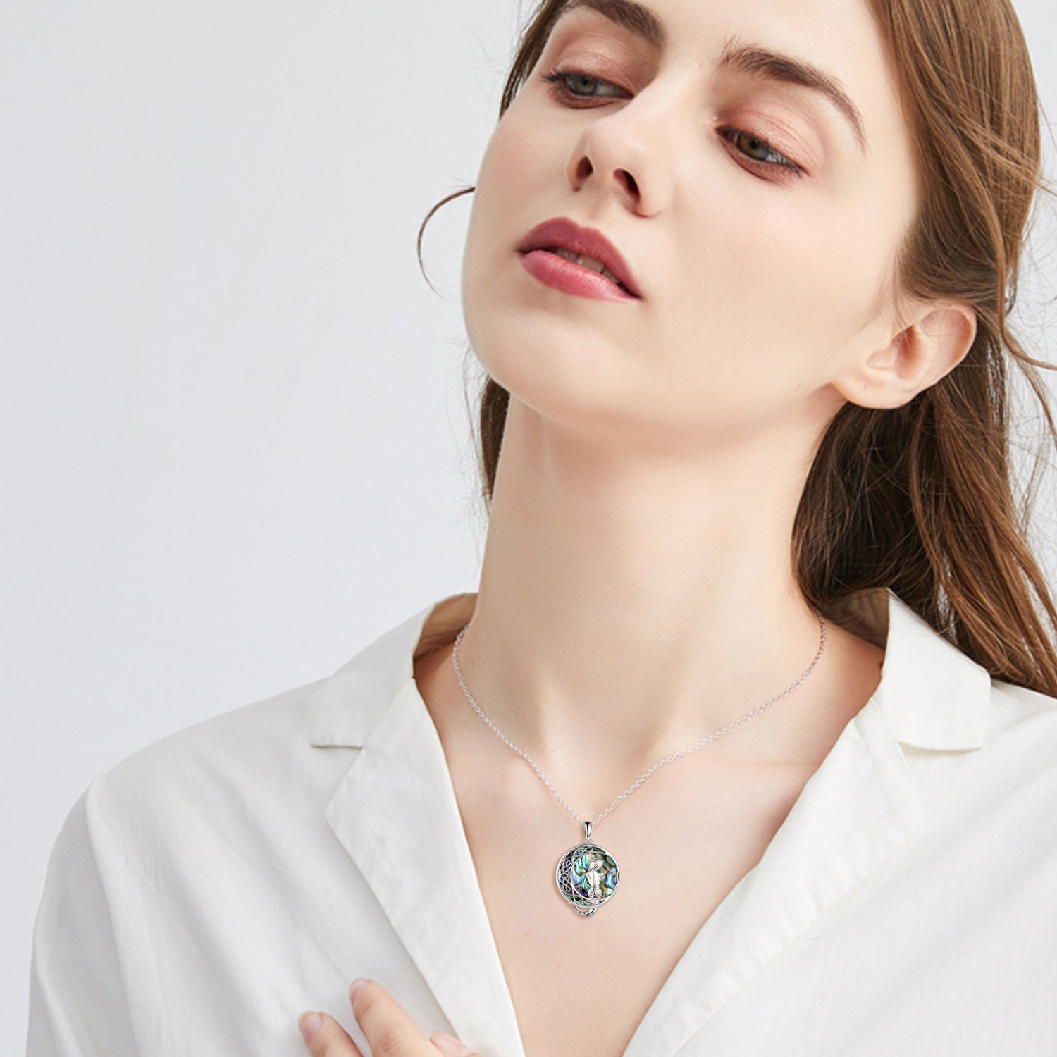 Crafted from Sterling Silver with White Gold Plating, this Circular Pendant Necklace features Abalone Shellfish, Celtic Knot, Mermaid, and Moon Motifs.