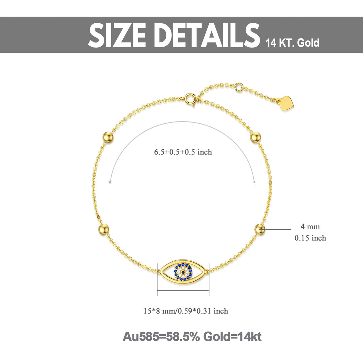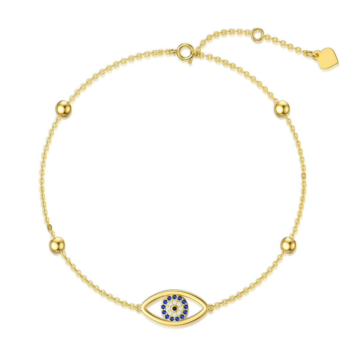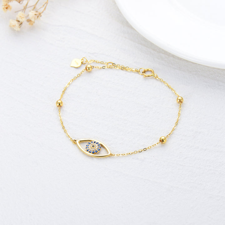 14K gold; cubic zirconia; evil eye charm; gold bracelet chain.