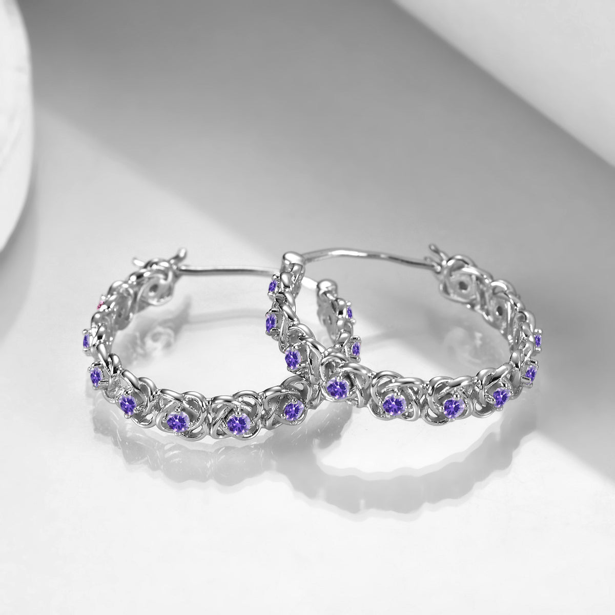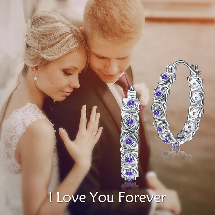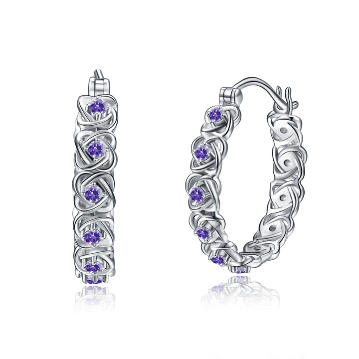 Crafted from Sterling Silver with a White Gold Plating, these Hoop Earrings feature a unique Cross Knot design and are set with breathtaking Purple Cubic Zirconia stones.