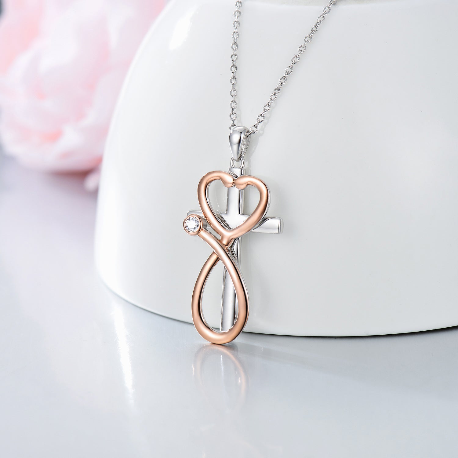 This Sterling Silver Two-tone Circular Shaped Cubic Zirconia Cross & Stethoscope Necklace by YFN is a heartfelt tribute blending faith and the medical profession. Crafted from high-quality sterling silver, the circular pendant is adorned with sparkling white Cubic Zirconia and features an entwined cross and stethoscope motif. The harmonious mix of silver and rose gold tones adds a touch of sophistication, making it an elegant and meaningful accessory for women.