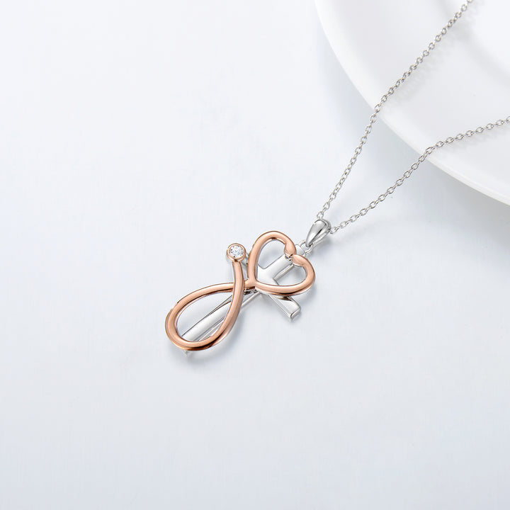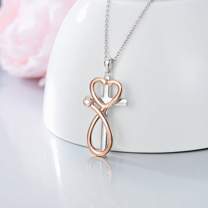 Crafted from Sterling Silver with Silver and Rose Gold Tones (Two-Tone). This is a Circular Shaped Pendant Necklace featuring Cross & Stethoscope motifs, set with White Cubic Zirconia.