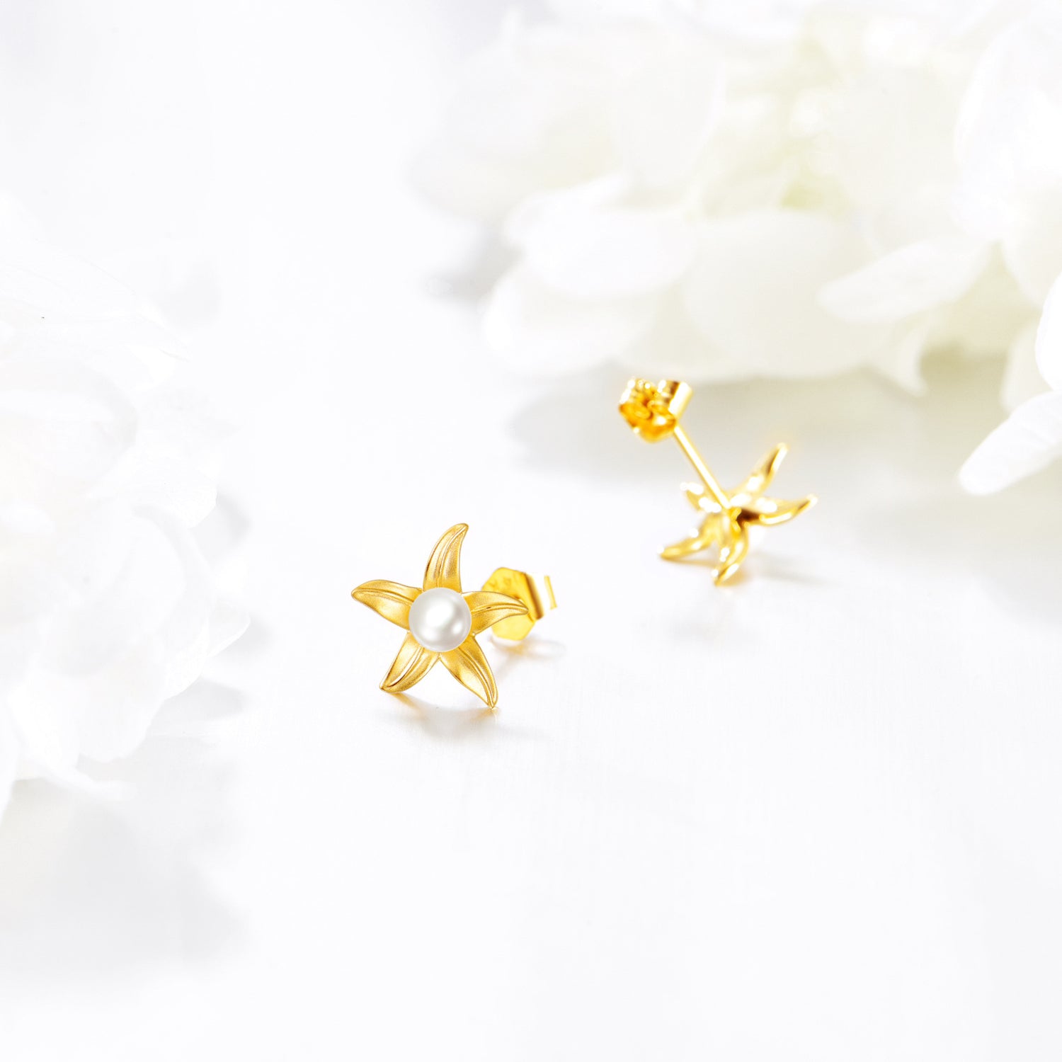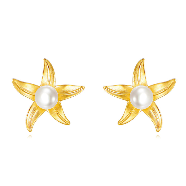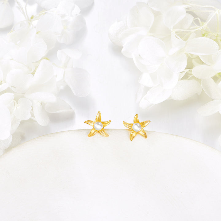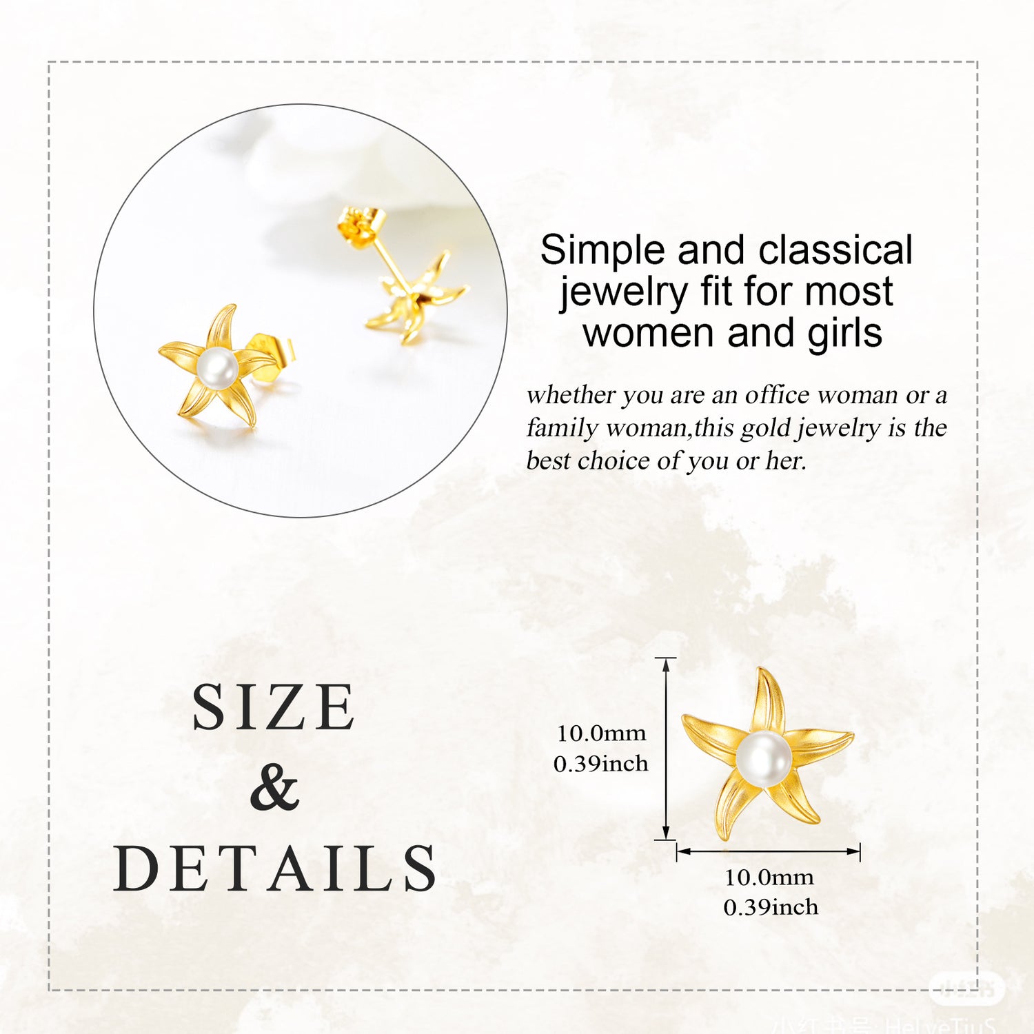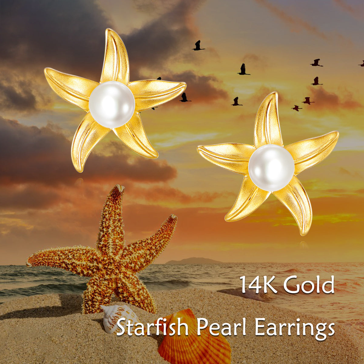 These stud earrings are crafted from 14K solid Gold. They feature Pearl accents and a starfish motif.