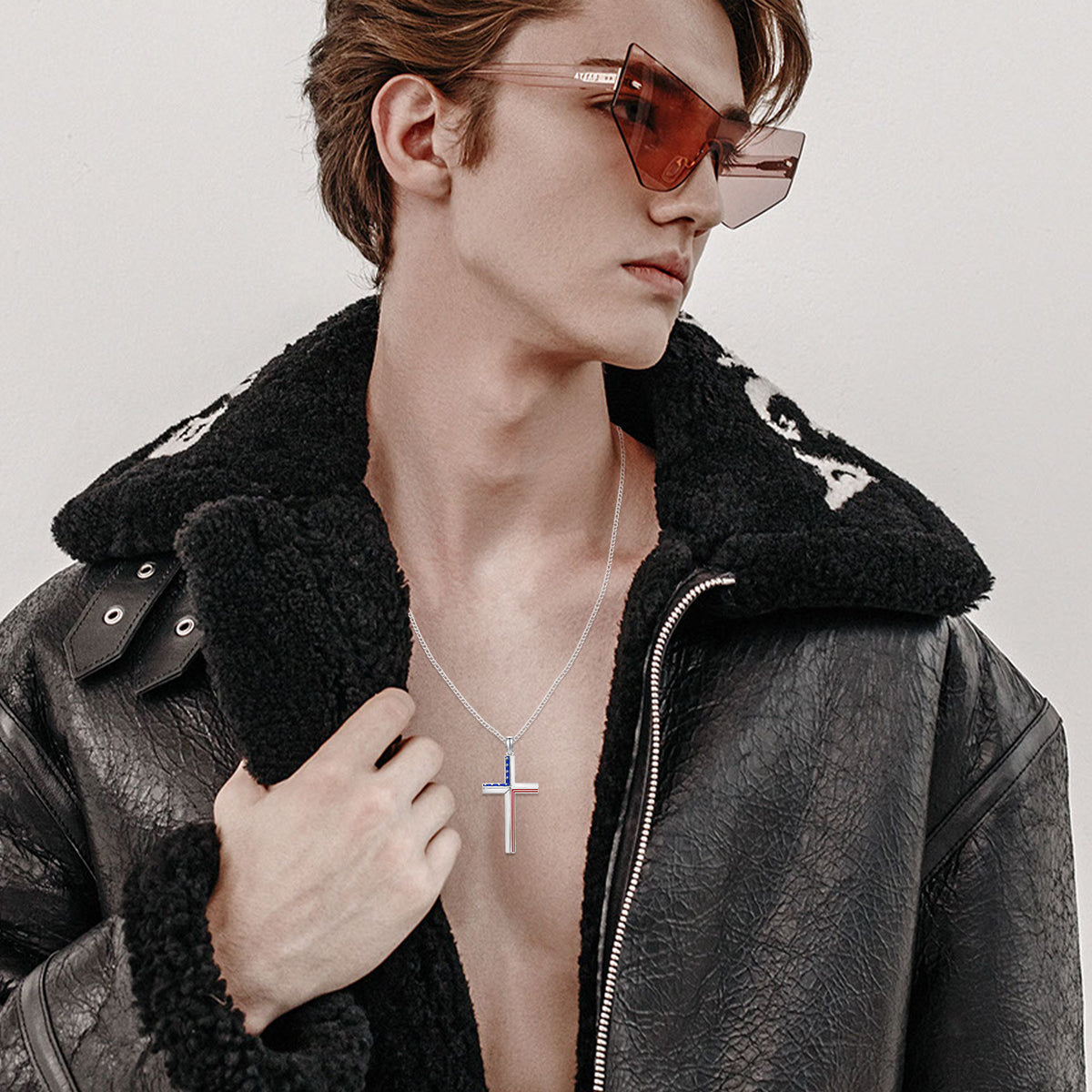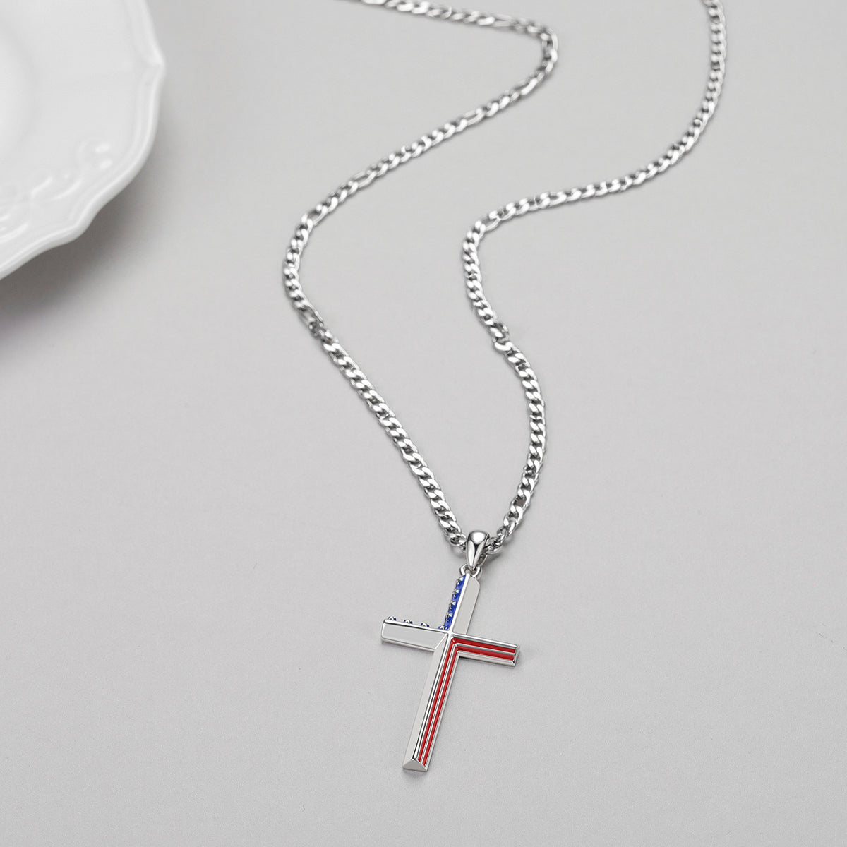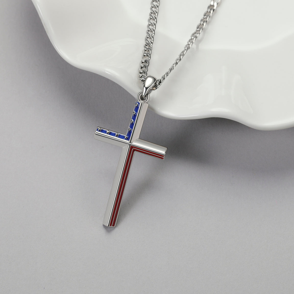 This no-stone Unisex Pendant Necklace is Crafted from Solid Sterling Silver with White Gold Plating, featuring a Distinctive American Flag and Cross design.