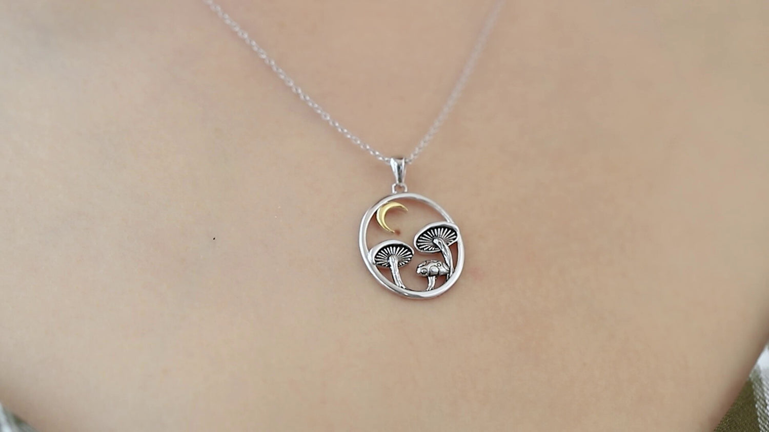 Sterling Silver Two-tone Mushroom & Moon Pendant Necklace