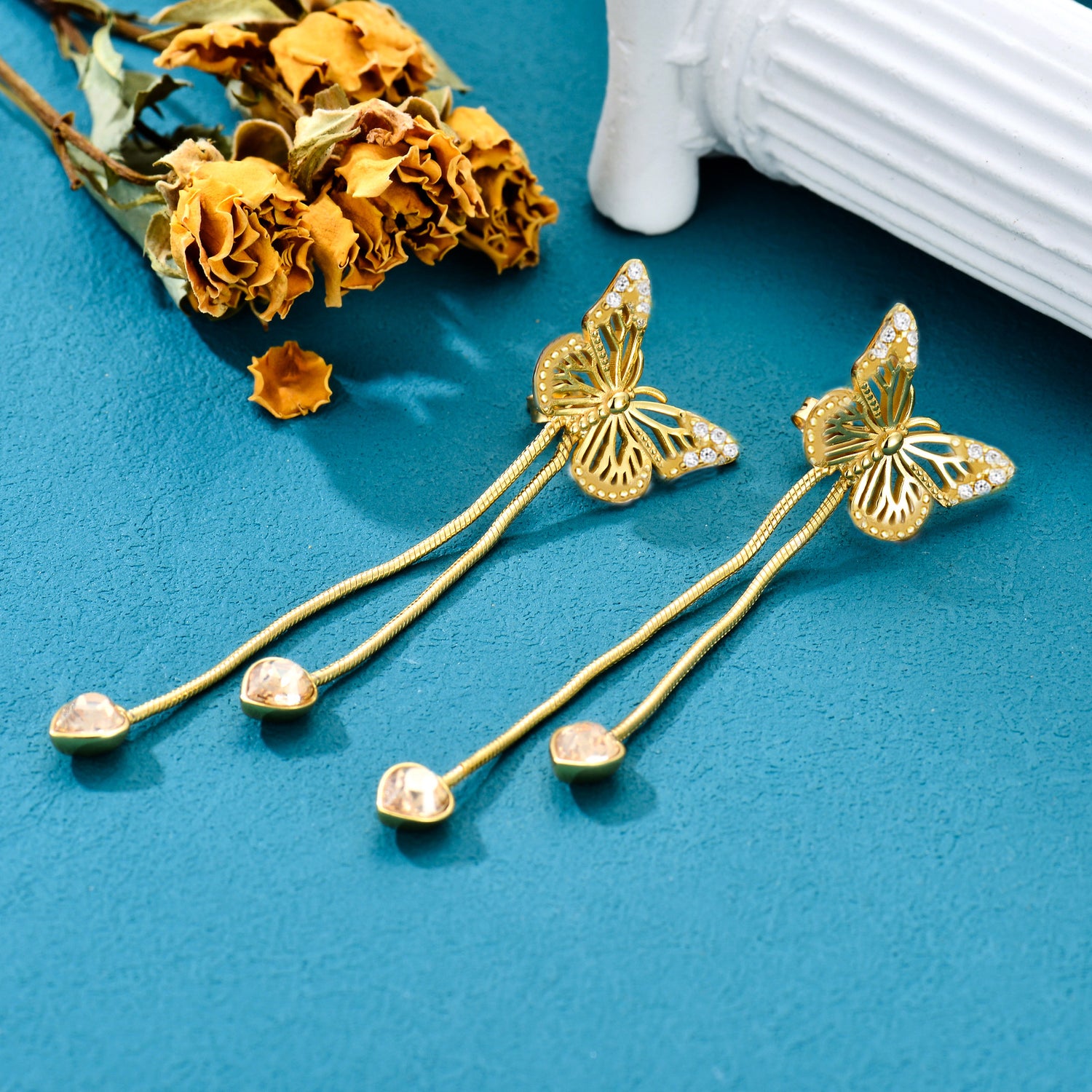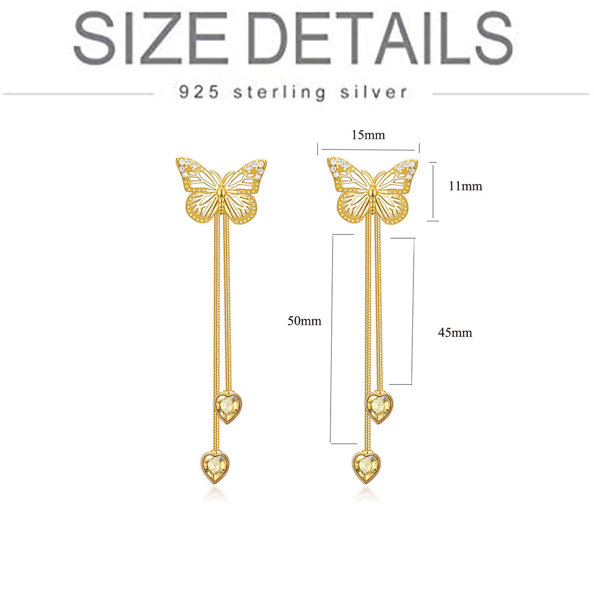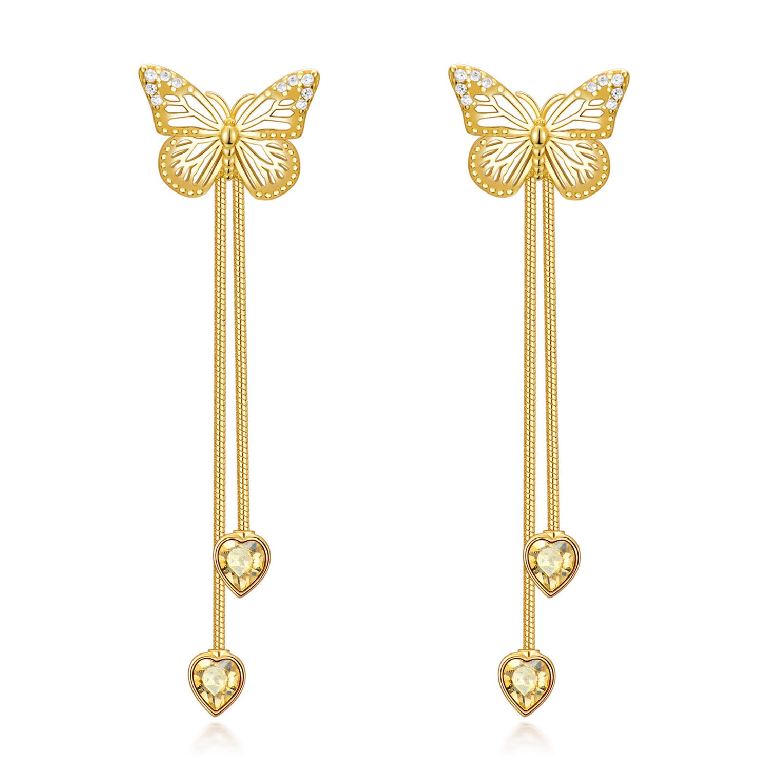 These Drop Earrings are crafted from high-quality Sterling Silver with Yellow Gold Plating and feature intricate Butterfly Designs set with dazzling Cubic Zirconia.