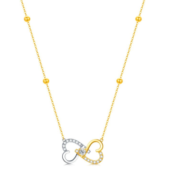 This Circular Pendant Necklace is crafted from 14K Gold in Two-Tone, Featuring a Heart With Interlocking Heart Detail, Adorned with Clear Cubic Zirconia and an Infinity Symbol.