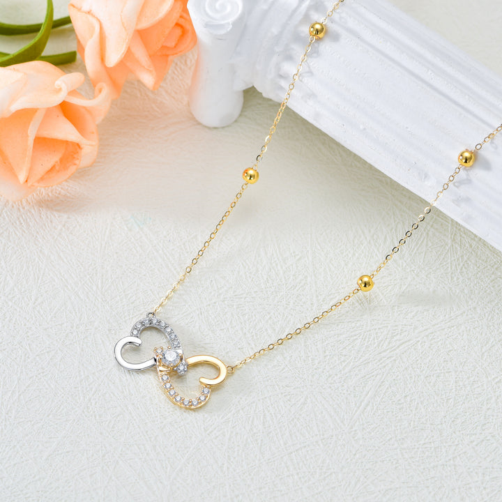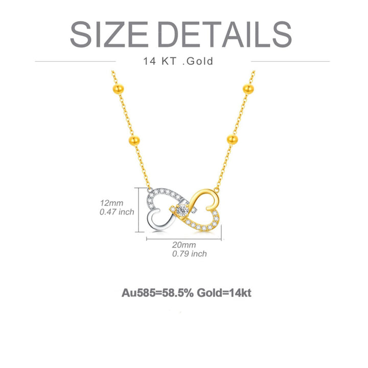 This 14K Gold Two-Tone Circular Cubic Zirconia Heart With Heart Wpendant Necklace For Women by YFN is the epitome of elegance for women. Crafted from 14K gold, the stunning circular-shaped pendant features a delicate heart with an interlocking heart detail, all beautifully embellished with clear cubic zirconia. The added infinity symbol signifies endless love and commitment, making it a perfect gift.
