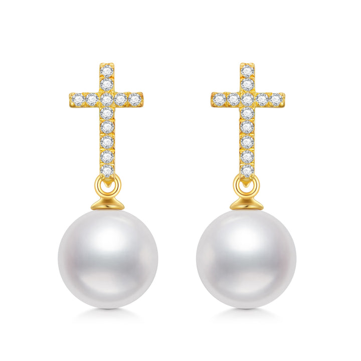 14K Gold Pearl Cross Drop Earrings