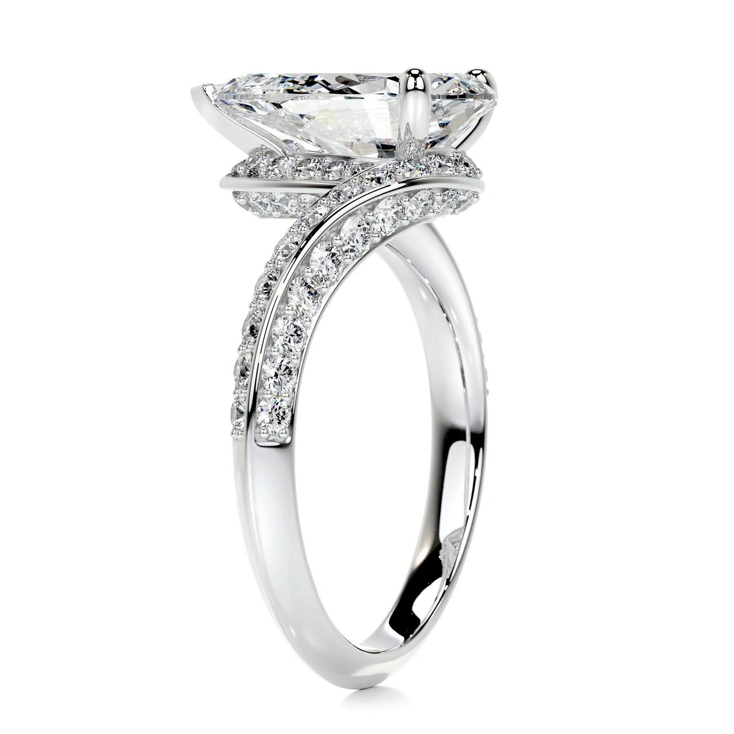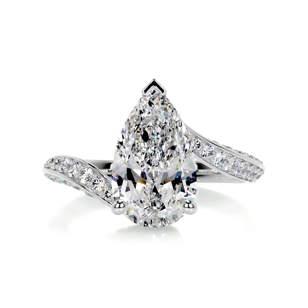 Crafted from 14K white gold. Designed as an engagement/promise ring. Center stone: Pear Cut Lab Created Diamond (0.5 to 3 CT, D color, VVS-VS clarity). Side stones: Lab Created Diamonds (0.5 CT T.W.). IGI Certified.