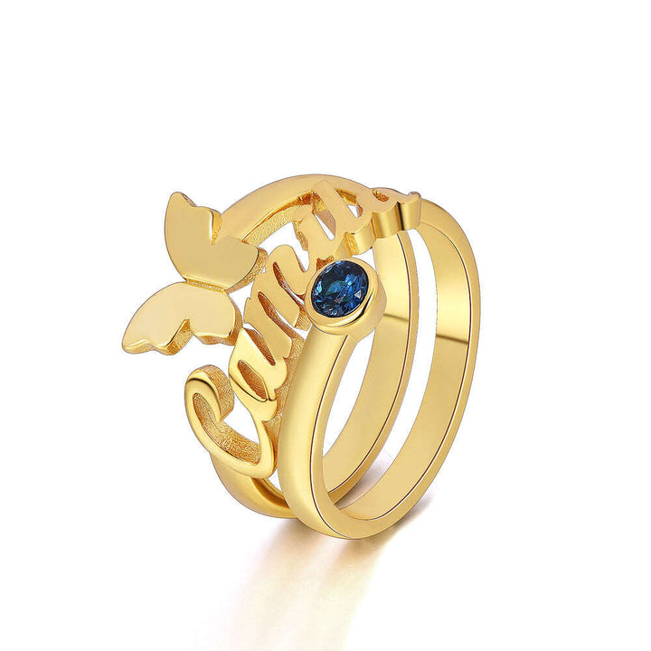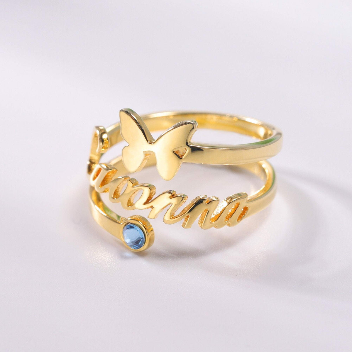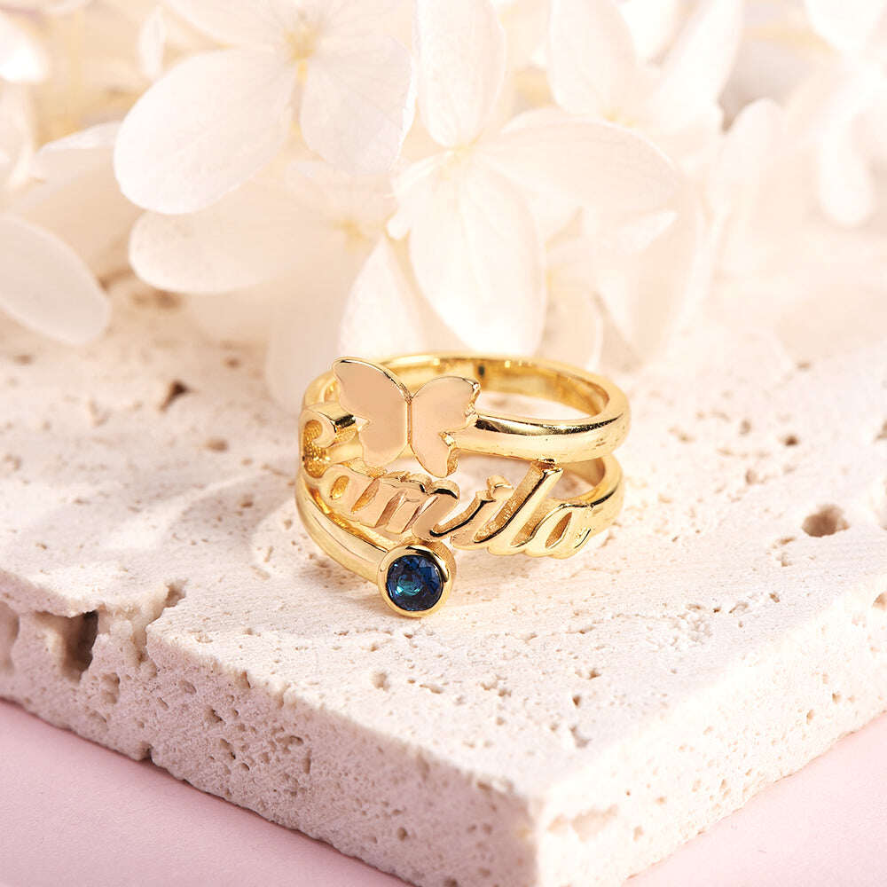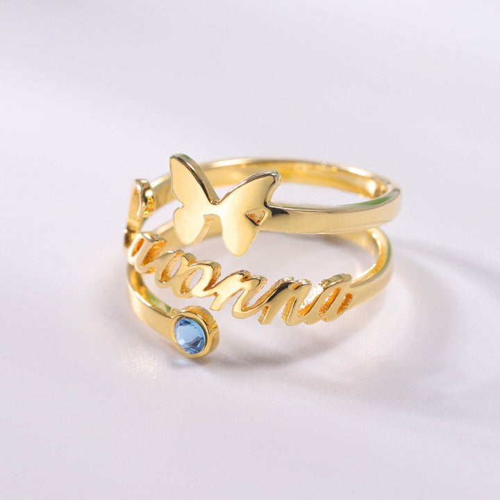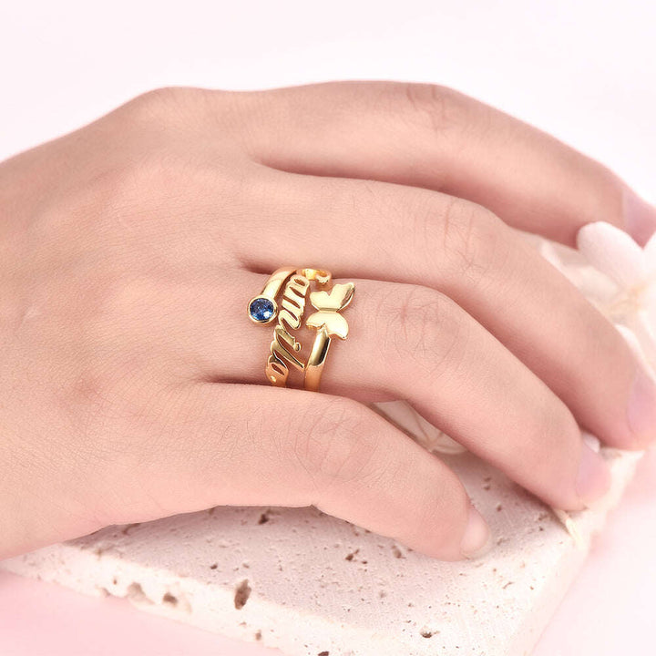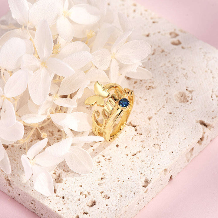10K Gold Birthstone Personalised Engraving Butterfly Open Ring For Women