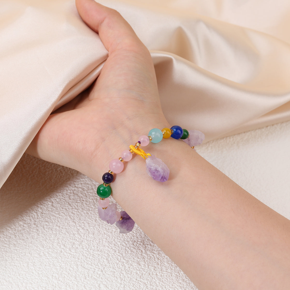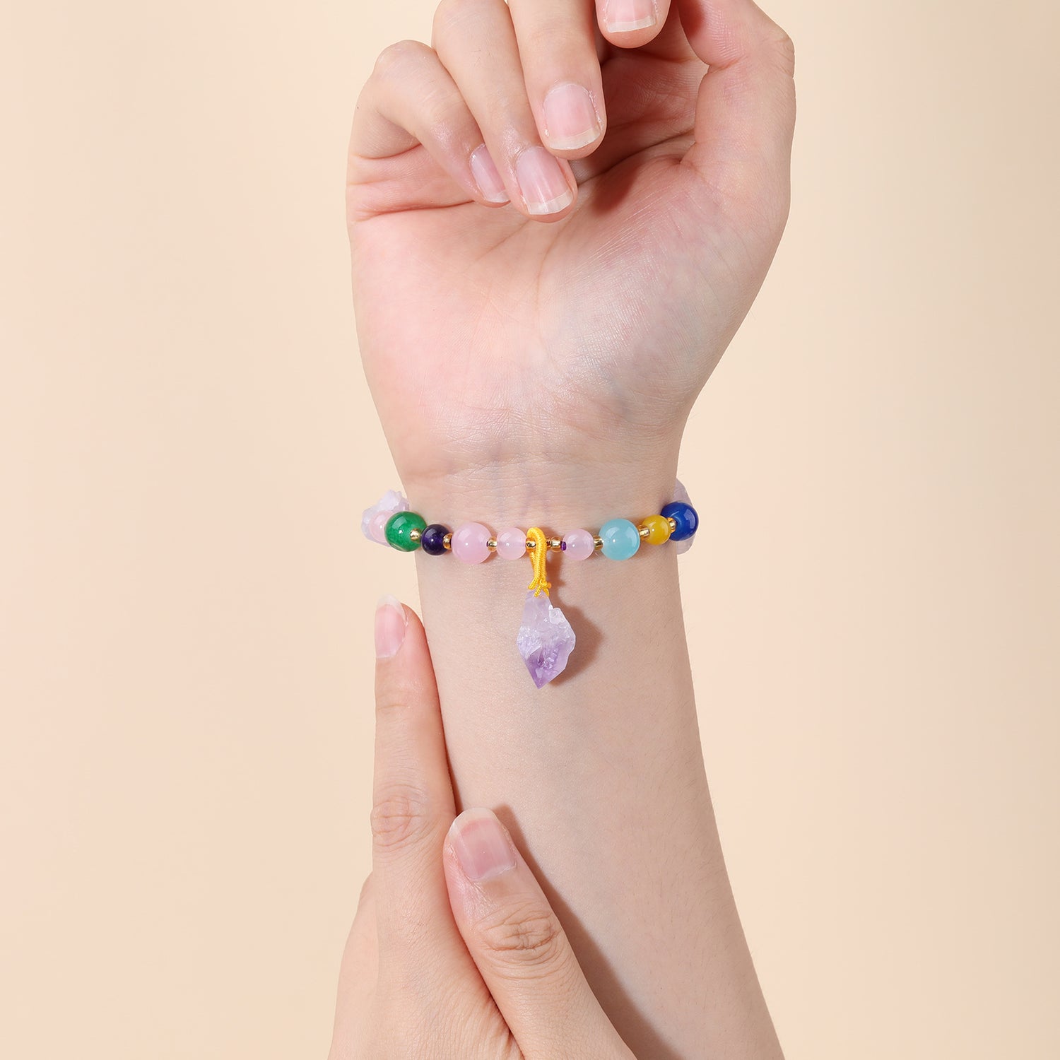 This Circular Shaped Agate & Amethyst Bead Charm Bracelet by YFN is a vibrant, earthy accessory that celebrates the raw, natural beauty of gemstones. It harmoniously blends the calming purple tones of unpolished, raw Amethyst crystals—known for their soothing and healing properties—with the striking, varied hues of polished Agate beads. This piece exudes a bohemian yet sophisticated vibe, perfect for layering or wearing solo. It offers a tangible connection to nature's artistry and energetic balance.
