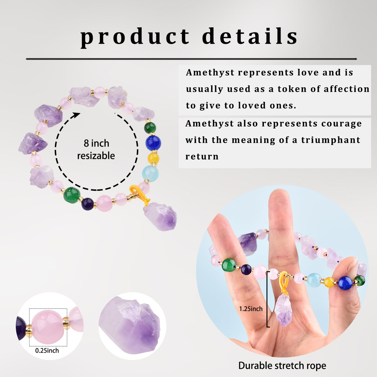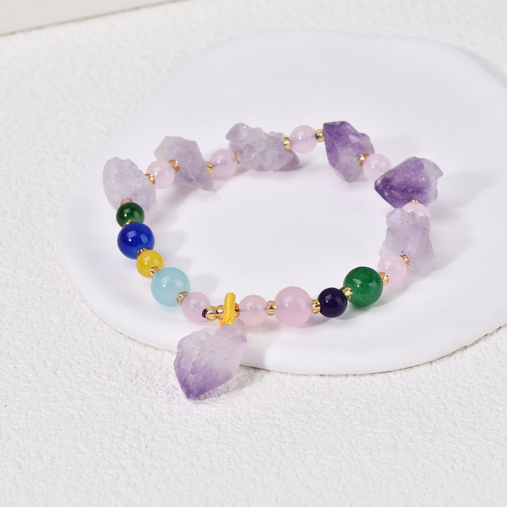Crafted on a durable cord, this charm bracelet features rough-cut Amethyst crystals and polished, circular-shaped Agate bead accents.