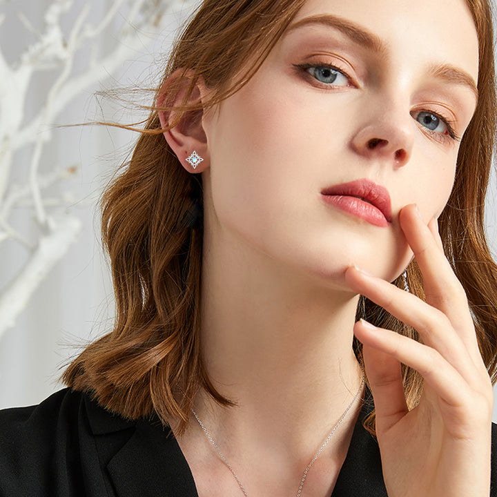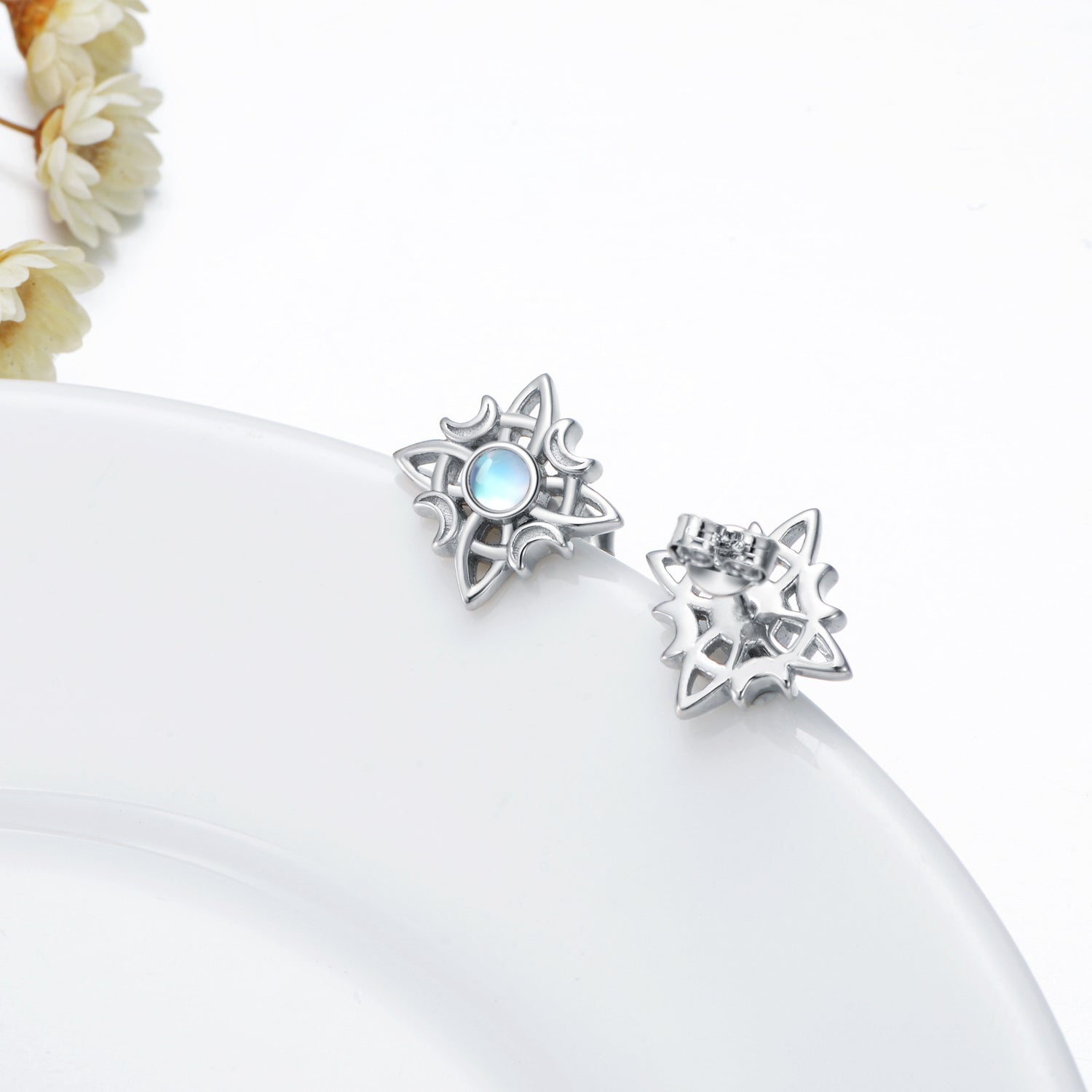 These Sterling Silver Circular Shaped Moonstone Star & Witch Knot Stud Earrings by YFN are enchanting stud earrings for sophisticated women. Intricately designed in a circular shape and exquisitely plated in white gold, they feature luminous moonstones along with dainty star and witch knot motifs. These earrings blend classic elegance with a hint of celestial mystery and mystical energy.