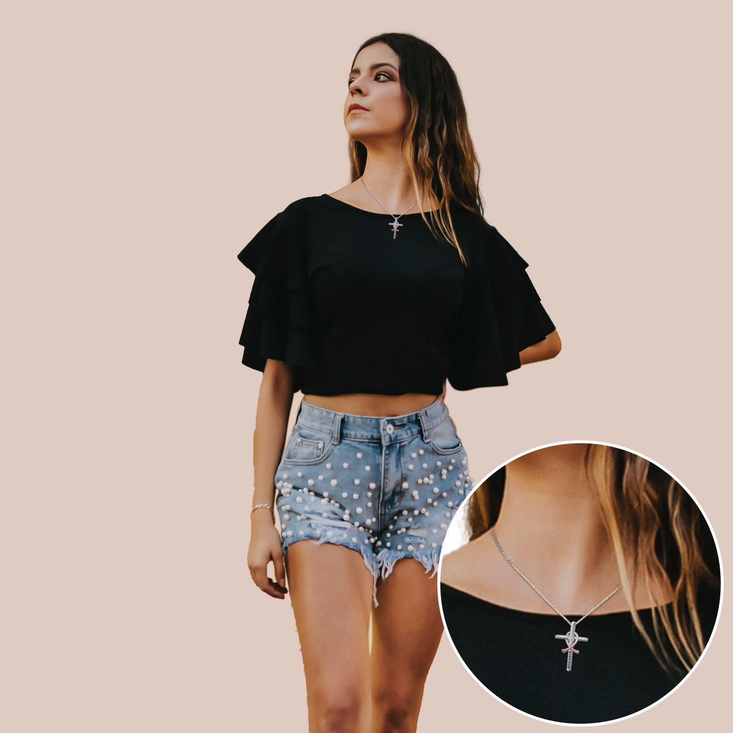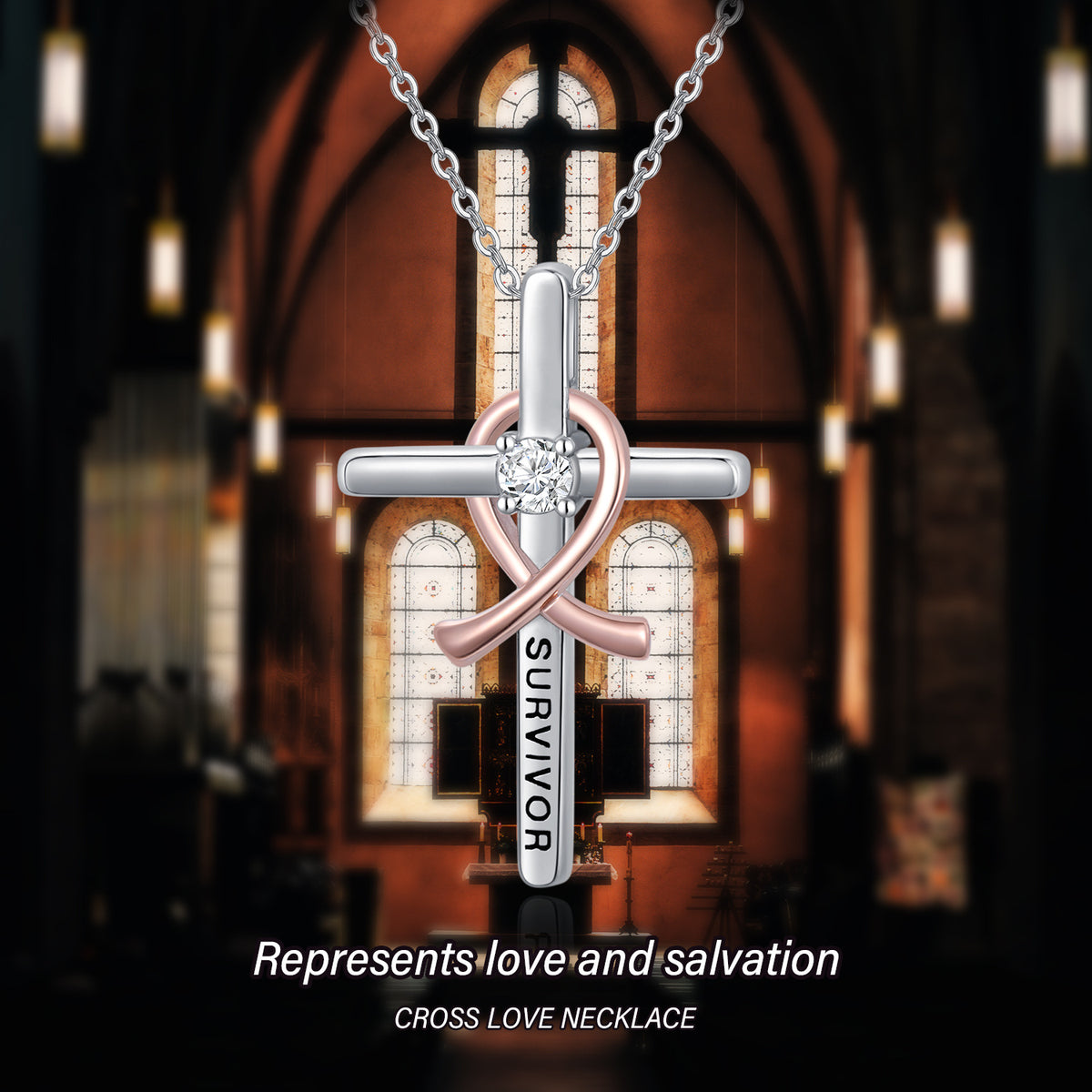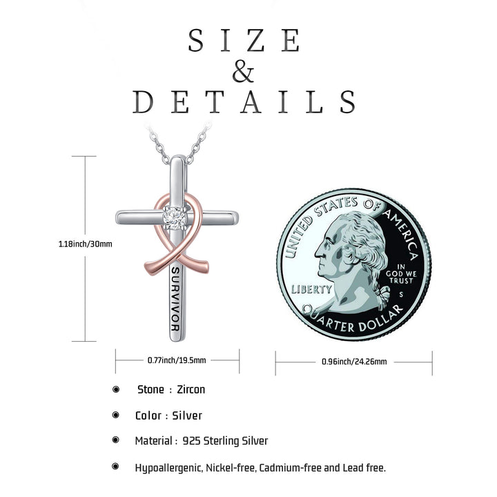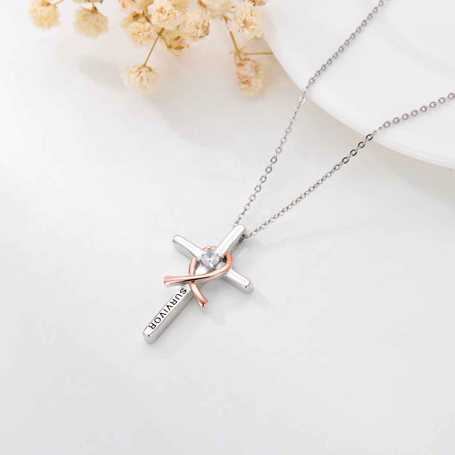 Crafted from high-quality Sterling Silver, this circular Pendant Necklace features brilliant clear Cubic Zirconia stones, accented with a Cross and Ribbon Design in Silver and Rose Gold Tones.