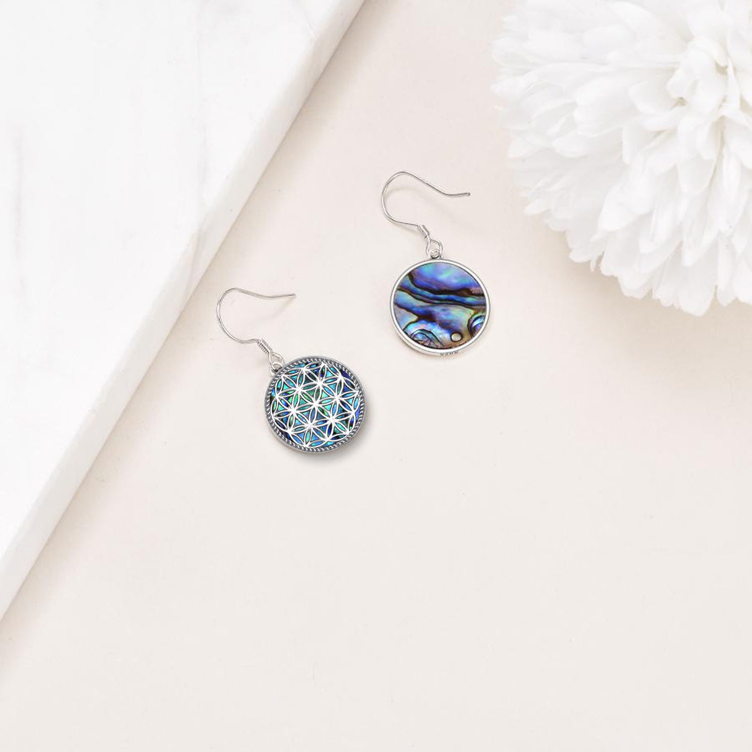Crafted from Sterling Silver with White Gold Plating. These are Drop Earrings featuring Abalone Shellfish and Celtic Knot motifs.
