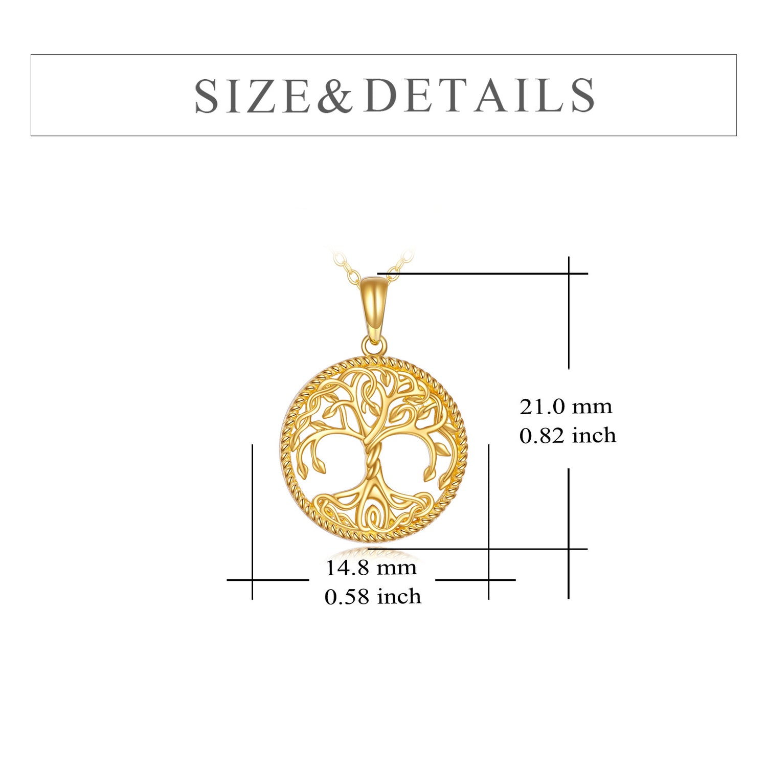 Pendant necklace crafted from solid 14K gold, featuring a stone-free Tree of Life design. Pendant measures 1.0 inch by 0.85 inches on an 18-inch rolo chain with a spring-ring clasp.