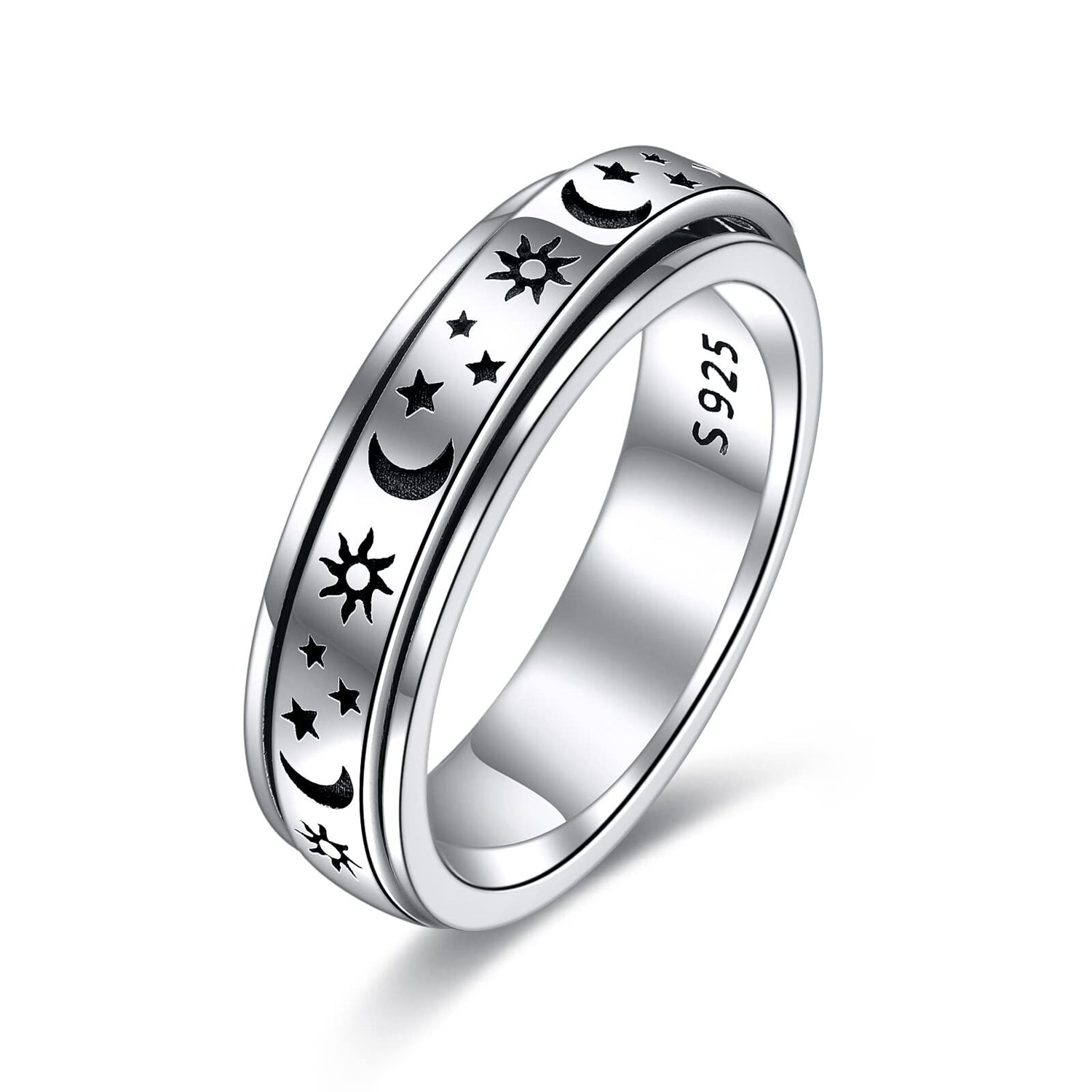 Sterling silver; celestial engraved motifs; spinner ring design.
