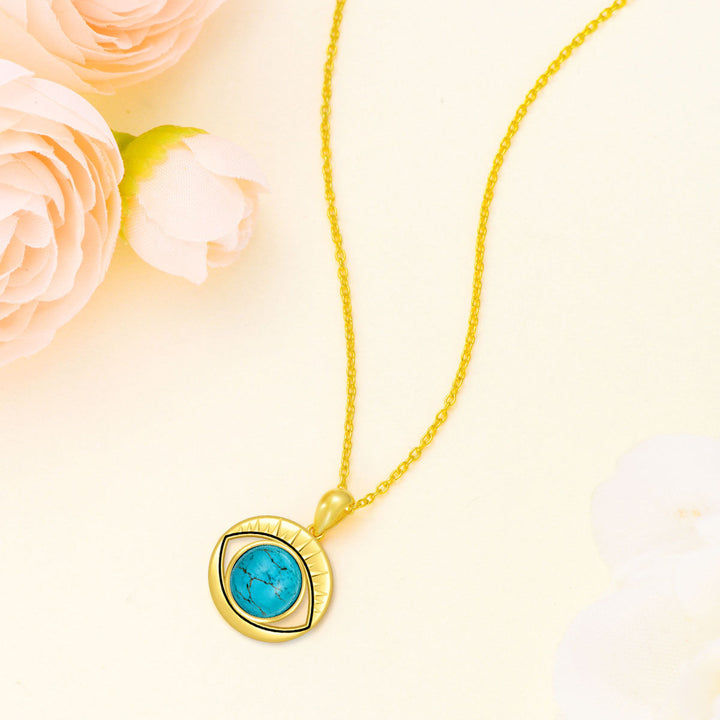 This pendant necklace is crafted from solid 14K Gold and features a circular-shaped Turquoise Evil Eye design, suspended from a fine gold chain.