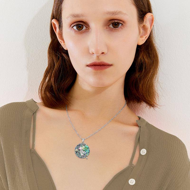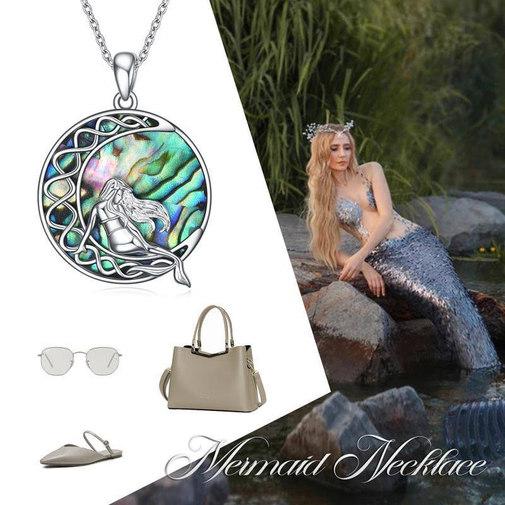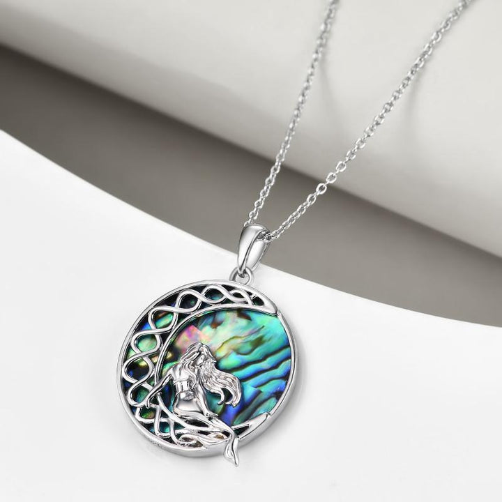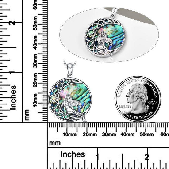 Crafted from Sterling Silver with White Gold Plating and Abalone Shellfish, featuring a Pendant Necklace with Celtic Knot, Mermaid, and Moon designs.