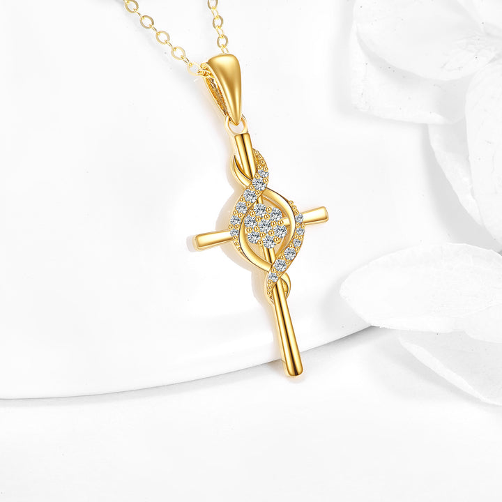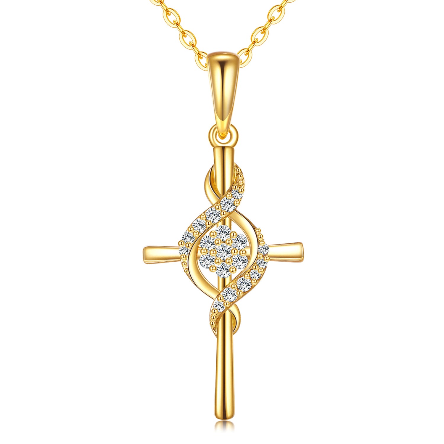 14K Gold Circular Shaped Cubic Zirconia Cross Pendant Necklace
