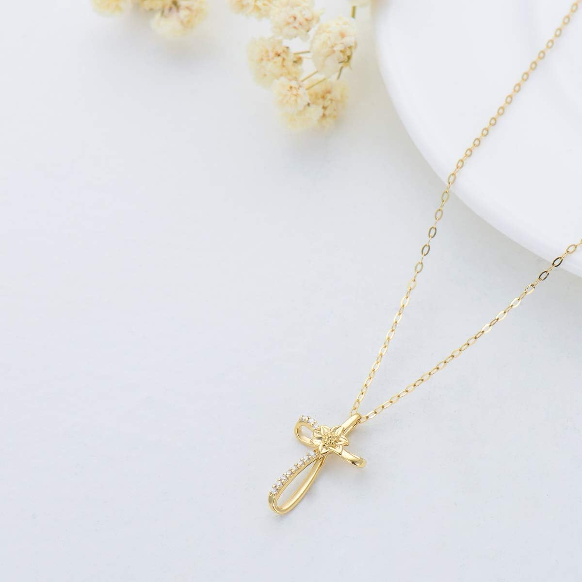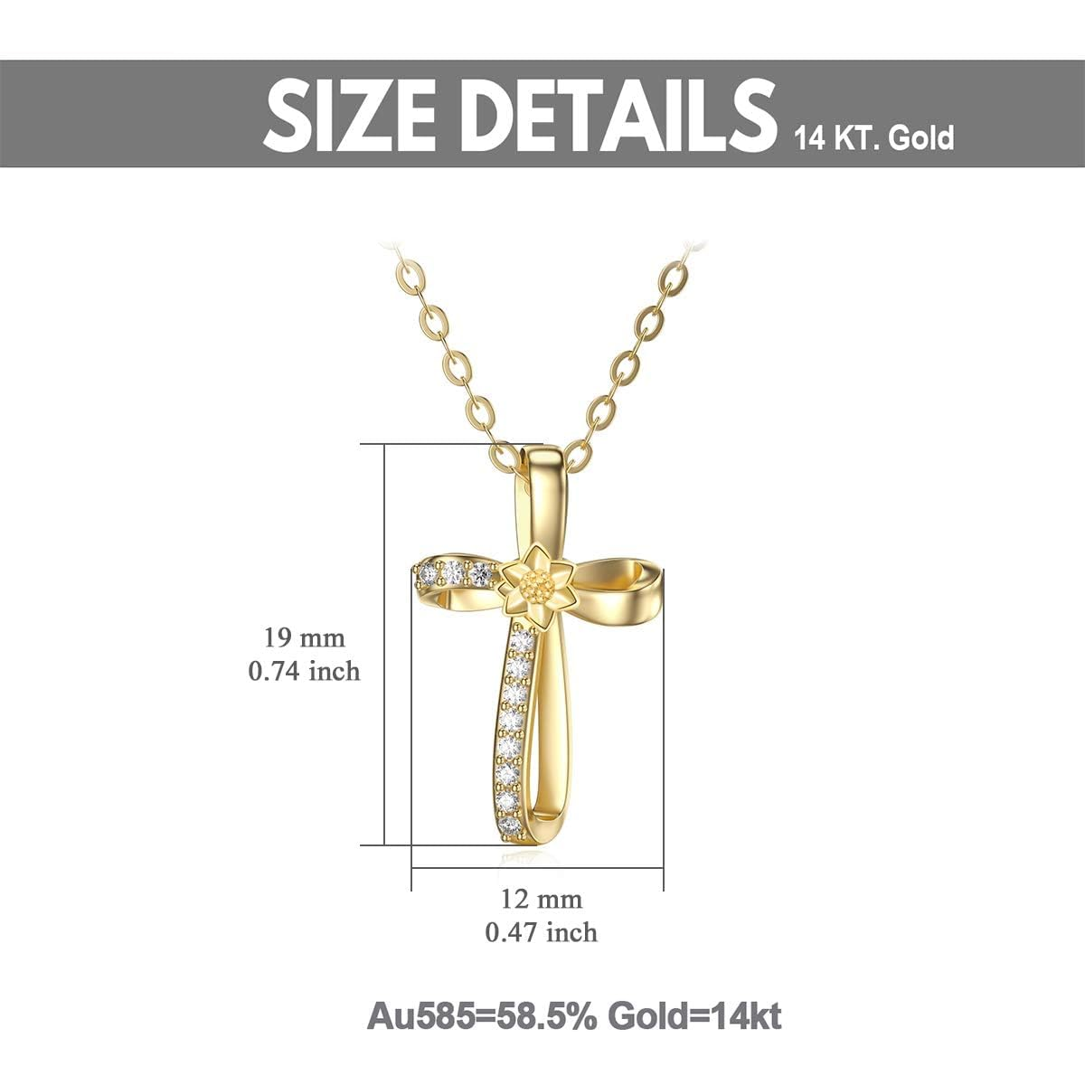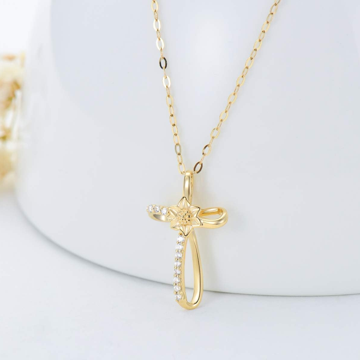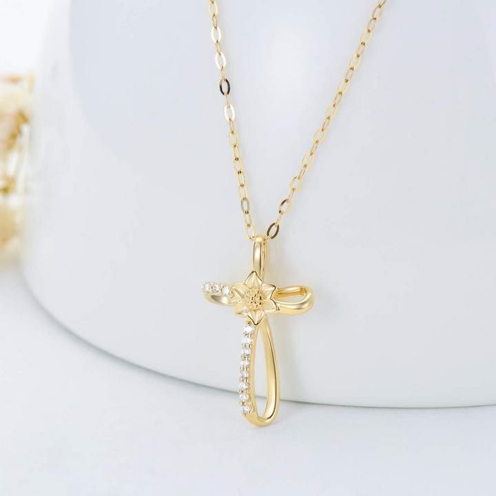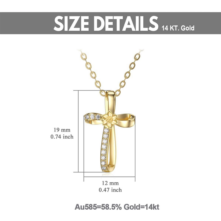 Crafted from 14K solid gold. Features dazzling Moissanite gemstones. Pendant design incorporates daisy and cross motifs. Suspended on a durable chain with a secure clasp.