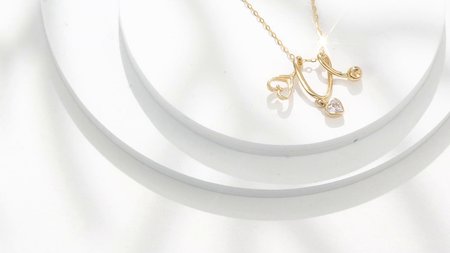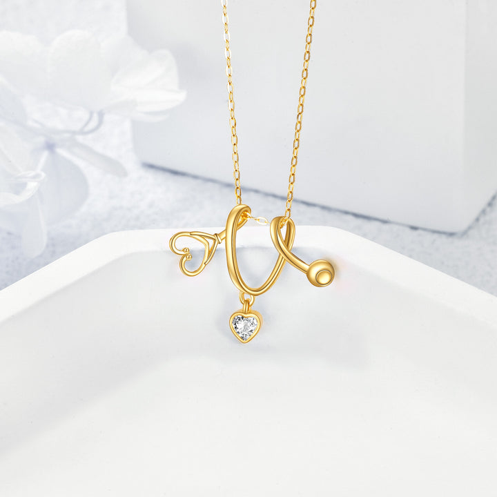 9K Gold Heart Zircon Stethoscope Pendant Necklace