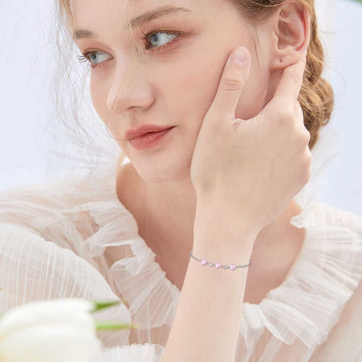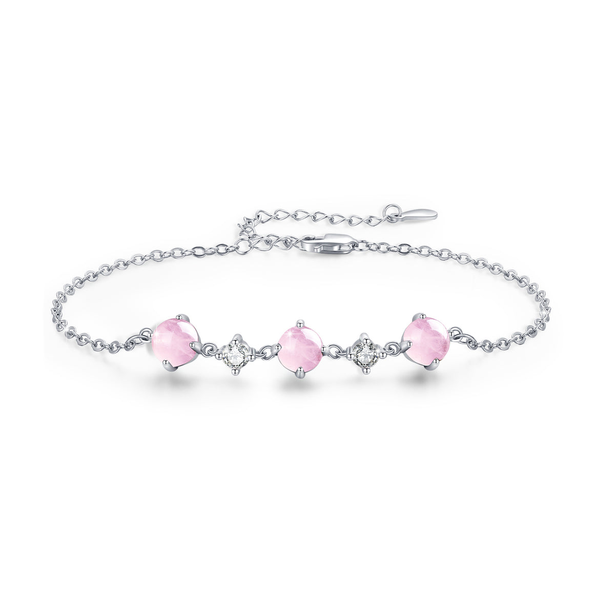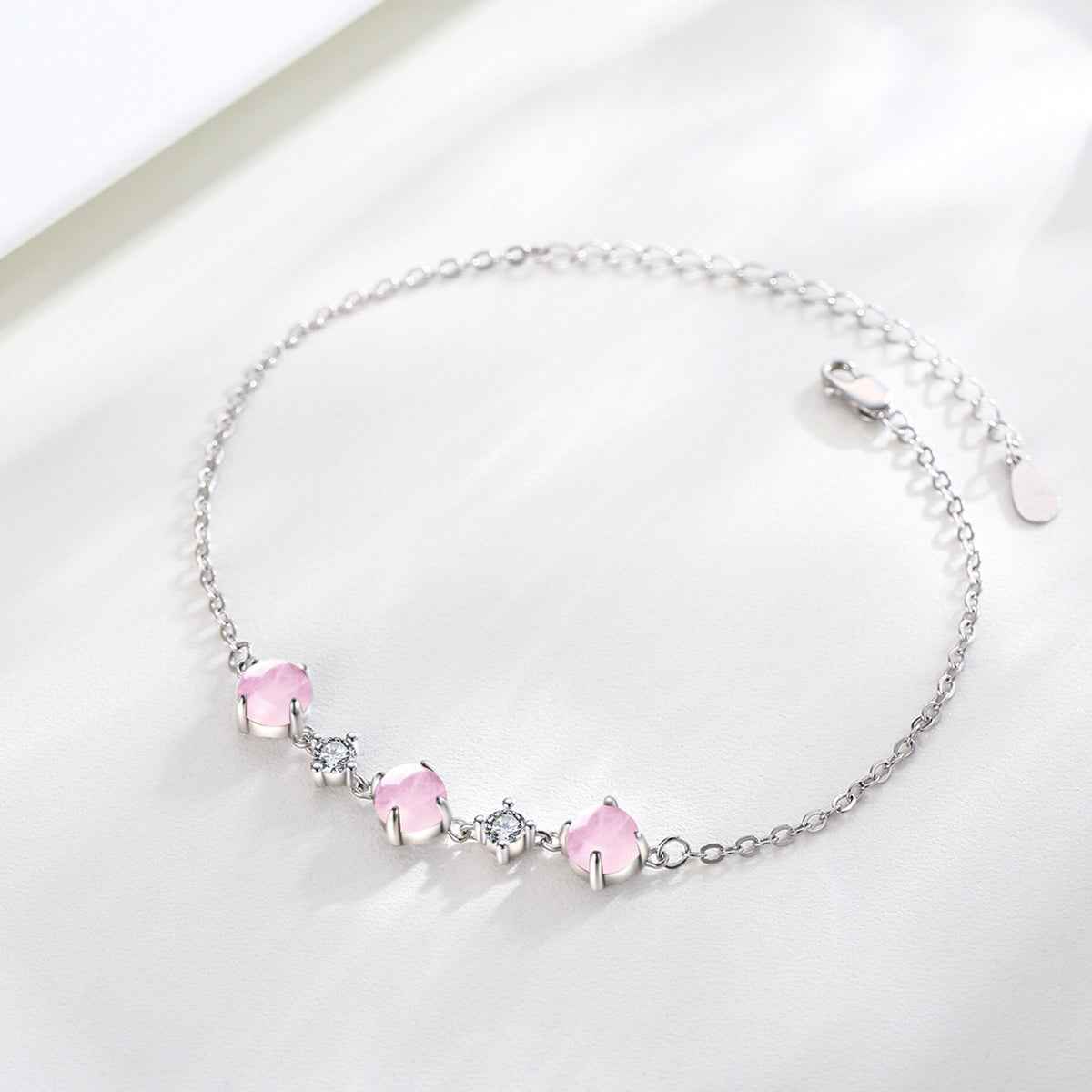 This Charm Bracelet is crafted from Sterling Silver with White Gold-Plated Finish, Featuring a Circular-Shaped Pink Crystal Bead.