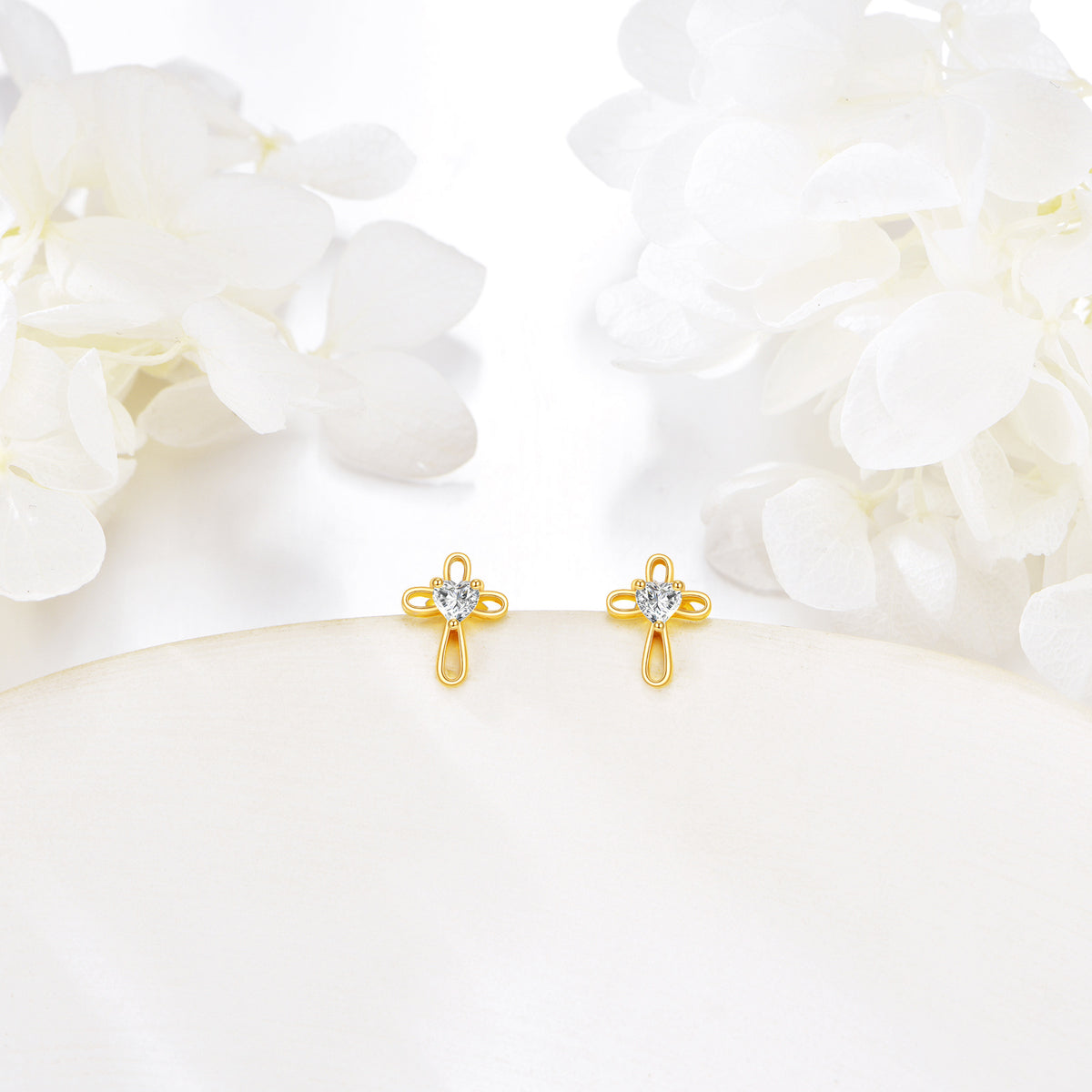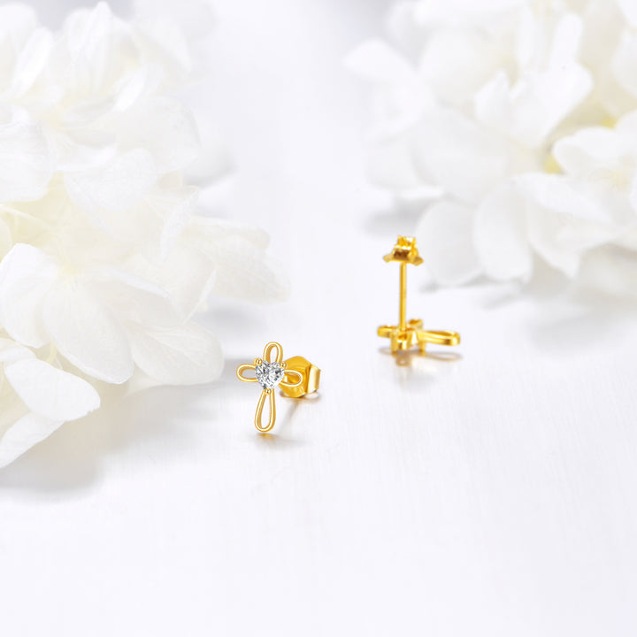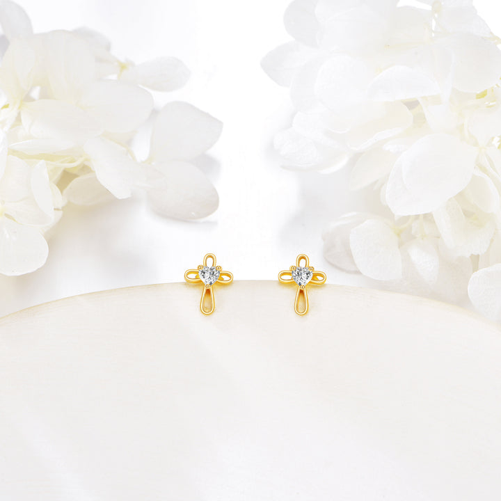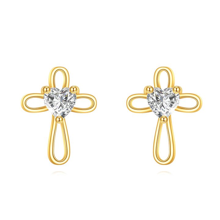 These Heart-Shaped Stud Earrings are Crafted from 14K Gold, adorned with Sparkling Clear Cubic Zirconia and a Delicate Cross design.