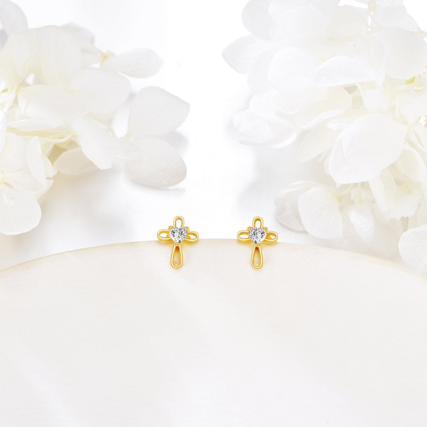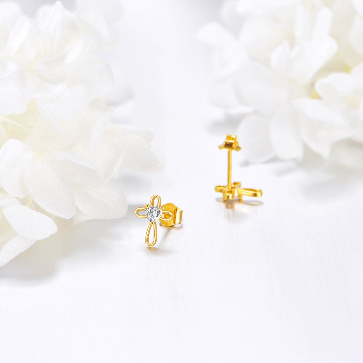 14K Gold Heart Shaped Cubic Zirconia Cross Stud Earrings