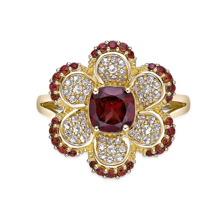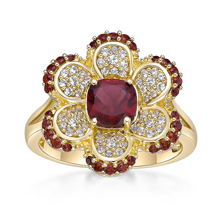 This band is crafted from 14K gold and features a large cushion-cut garnet center stone and round accent white sapphire gemstones, set in a split shank flower motif, with custom engraving available.