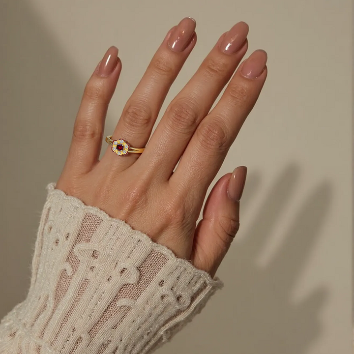 This Cushion Garnet with Round White Sapphire Flower Split Shank Couple Custom Engraving Band by YFN is a bold, luxurious statement piece symbolizing enduring romance and brilliance. Set in 14K gold, the ring highlights a striking cushion-cut garnet and white sapphire duo, expertly cut and IGI-certified for exceptional sparkle. The flower split shank design adds a romantic touch. Offering personalized engraving, this ring is a unique and cherished keepsake, perfect for celebrating memorable milestones.