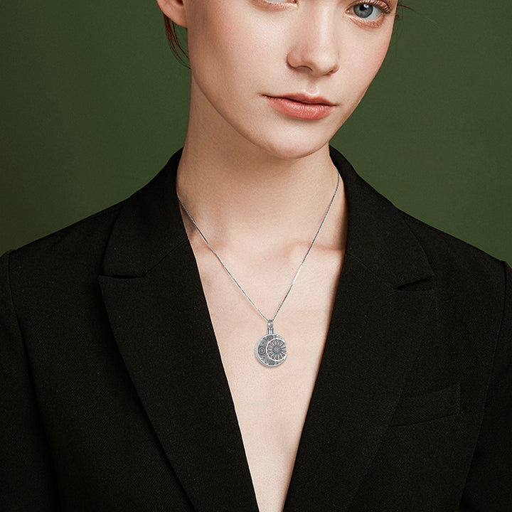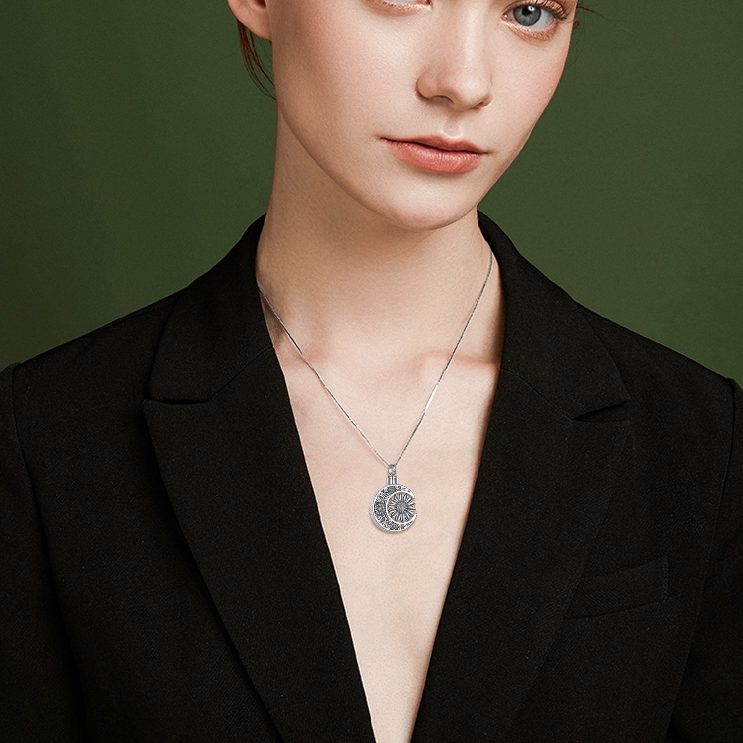 This no-stone Urn Necklace for Ashes is crafted from High-Quality Sterling Silver with a Retro Silver finish, featuring intricate Sunflower and Moon designs.