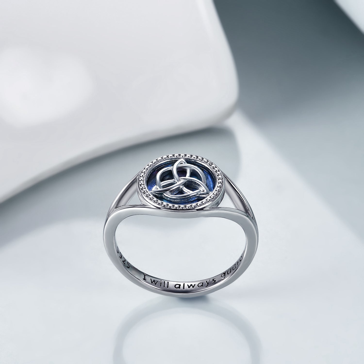 Crafted from Sterling Silver and White Gold Plated, this Ring features Abalone Shellfish and a Celtic Knot design, with the engraved word "I Will Always Guard."