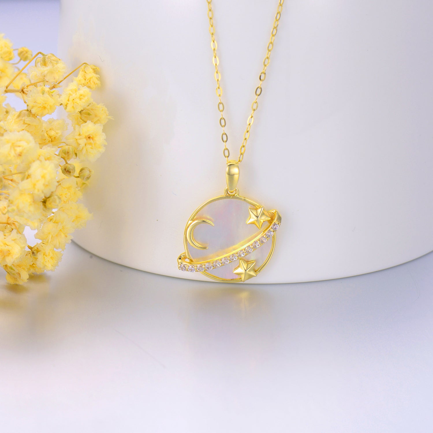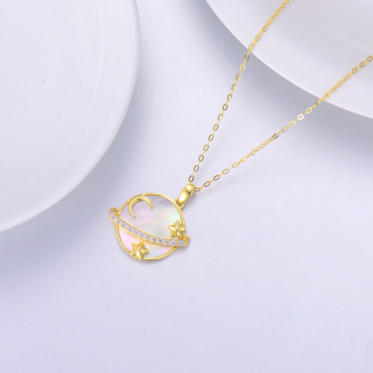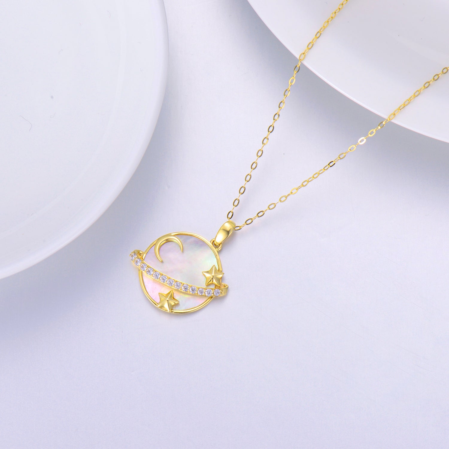 14K Gold Round Mother Of Pearl Moon & Planet With Star Pendant Necklace For Women