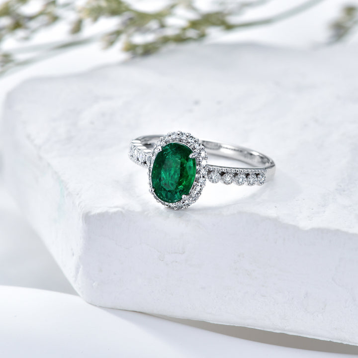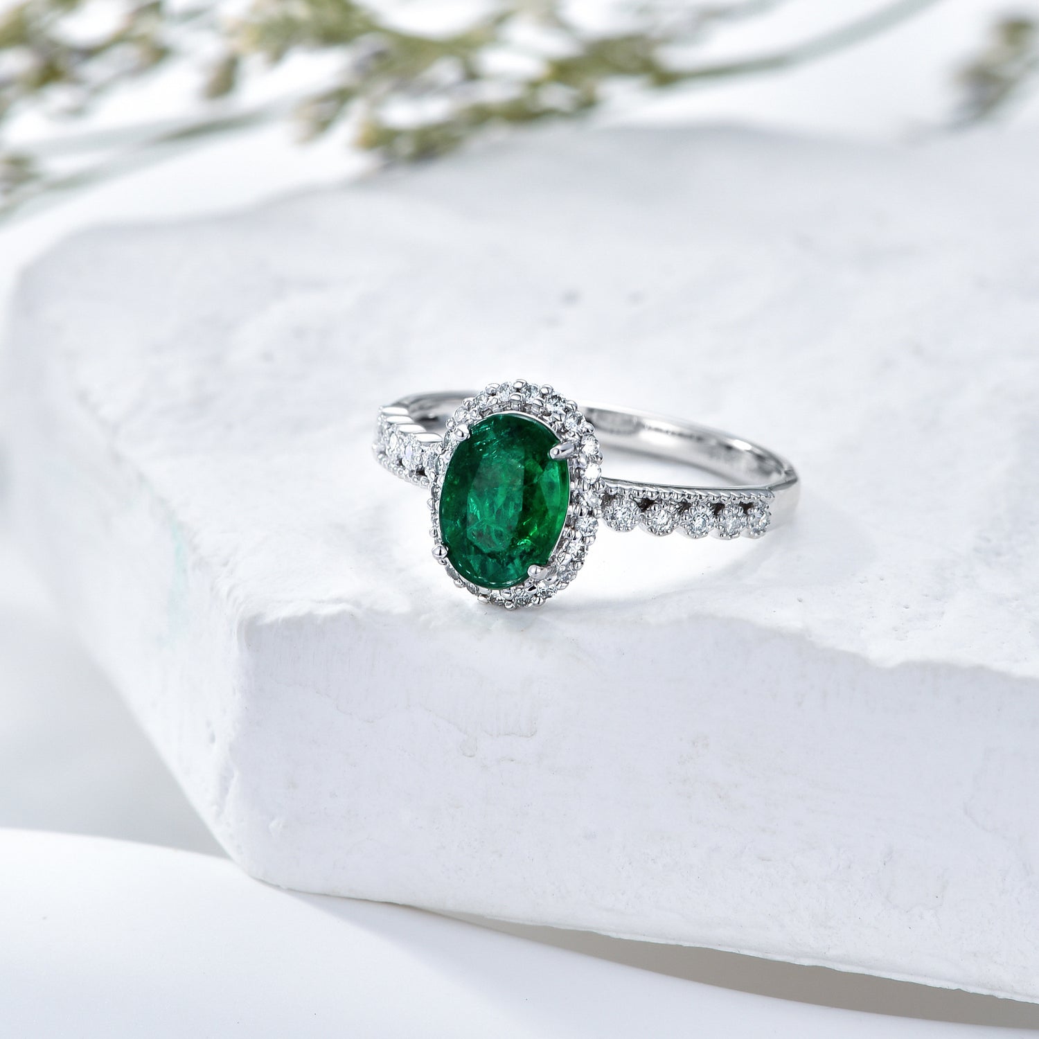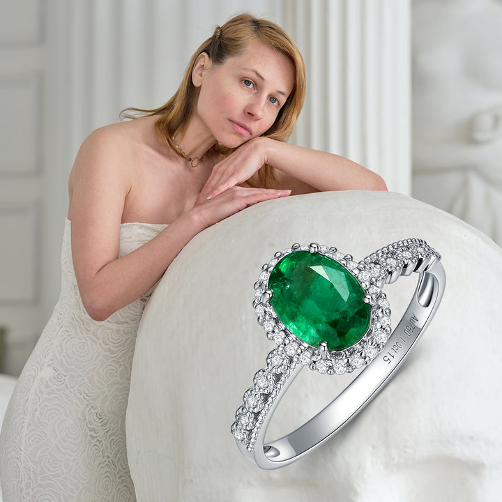 This 18K White Gold Oval Emerald Engagement Ring by YFN is a bold and glamorous statement of commitment. The large oval lab-created diamond and emerald center stone, set in 18K white gold, offers a sophisticated, radiant aesthetic. The impressive carat weight and gold setting ensure it exudes a luxurious, memorable vibe, perfect for the woman who desires a high-impact, elegant, and ethically sourced piece.