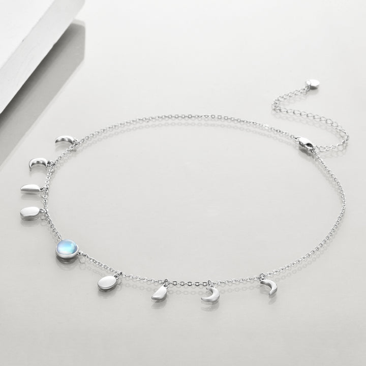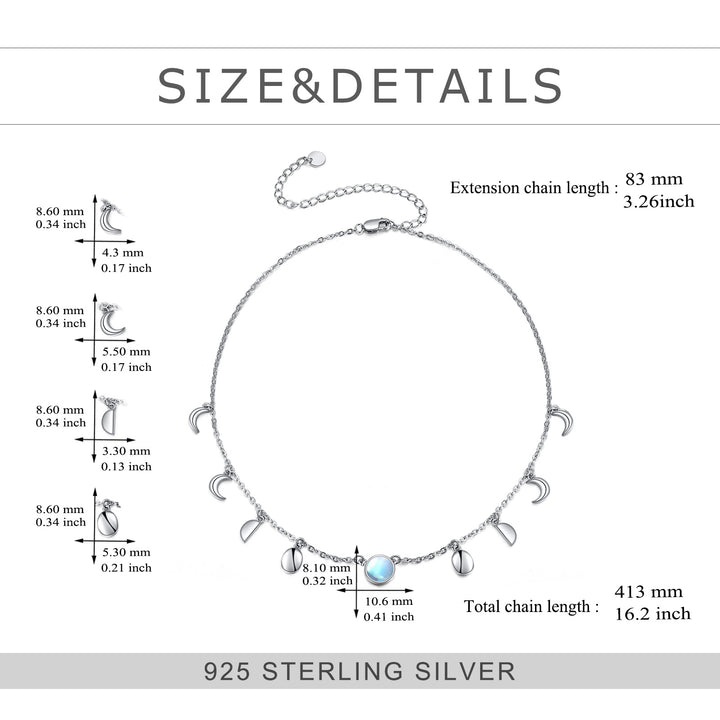 This Metal Choker Necklace is crafted from Premium Sterling Silver with White Gold Plating, Adorned with a Shimmering Moonstone Centerpiece and Intricate Moon Designs.