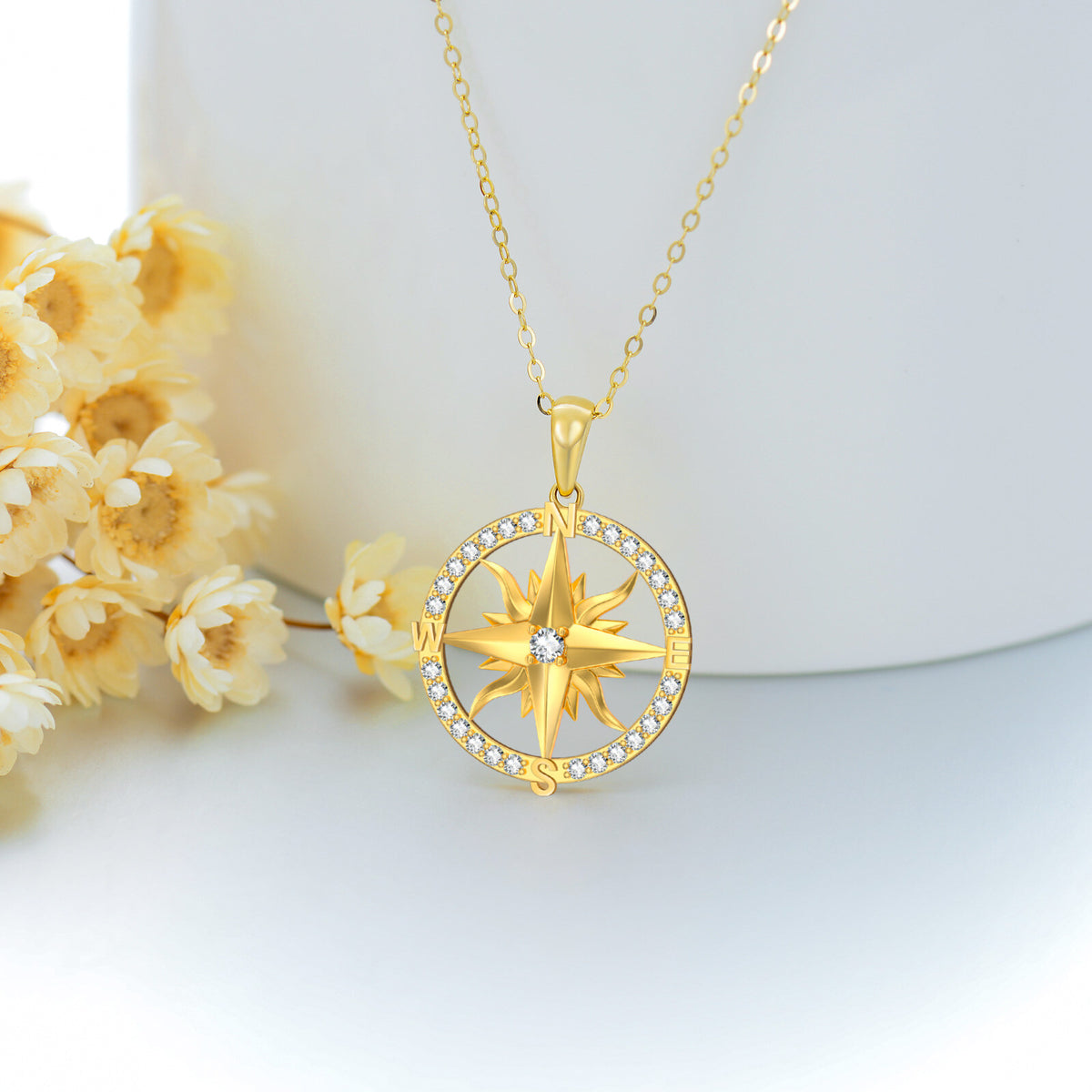 This 14K Gold Moissanite Compass Pendant Necklace by YFN symbolizes guidance, clarity, and purposeful movement. The Moissanite at the center adds luminous brilliance, enhancing the compass motif with a sense of direction and intention. Crafted in gold, the piece blends meaningful symbolism with refined craftsmanship, making it ideal for women who navigate life with elegance and confidence.